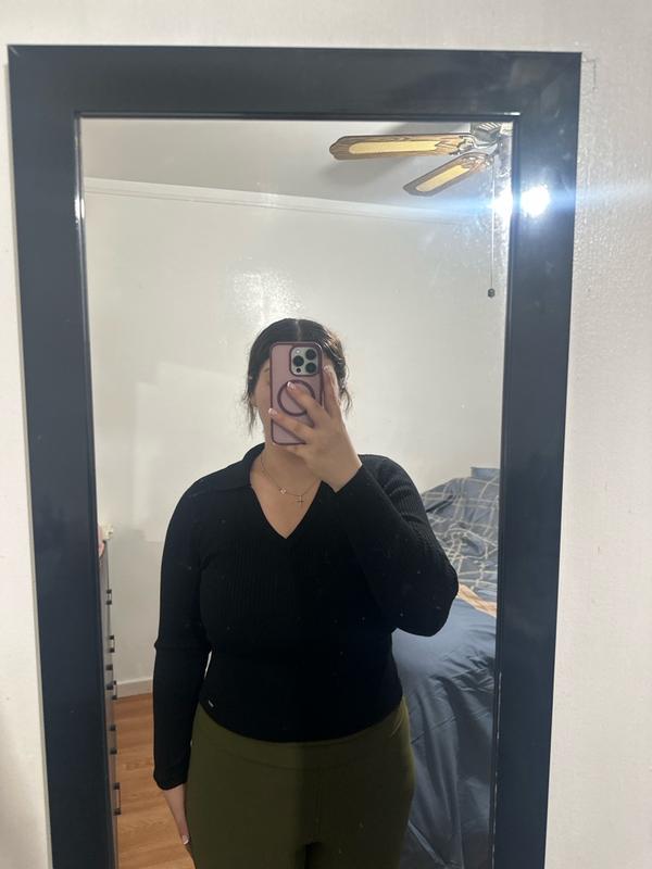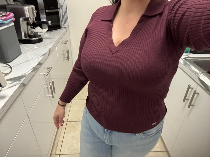 I really like this DKNY top! The color is super pretty in person .kind of a deep burgundy that looks great with jeans. The material is thick and stretchy but still soft, and it fits really nicely without feeling tight. I also love the little collar and v-neck, it makes it look a bit dressy but still comfy enough to wear every day. Definitely one of those tops that make you feel put together without trying too hard. It’s very comfy