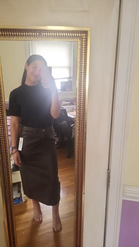 I love everything about this skirt! The length is perfect for modesty and warmth! You can dress it up with a sexy top and heels or dress it down with a sweater and sneakers. It's very comfortable as it has an inner lining, so you do not have to worry about the leather bunching up at all.
