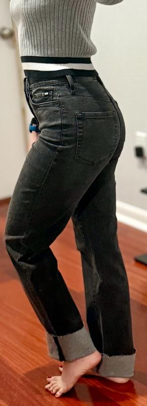 I love the DKNY High Rise classic jeans. The material is so soft and is a little stretchy for the perfect fit. The cuff are great to wear with boots or heels and the faded color makes it timeless. Highly recommend.