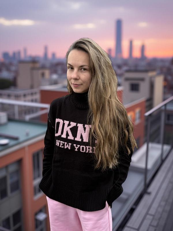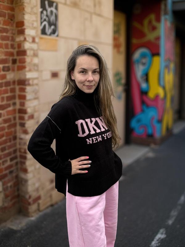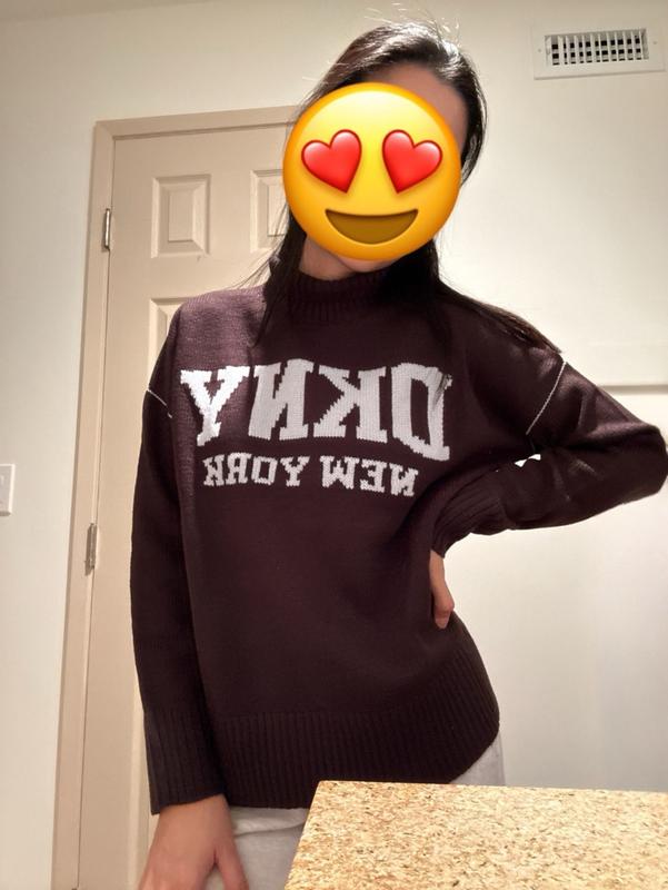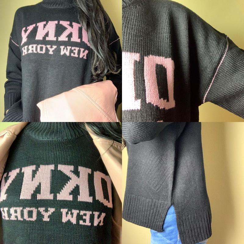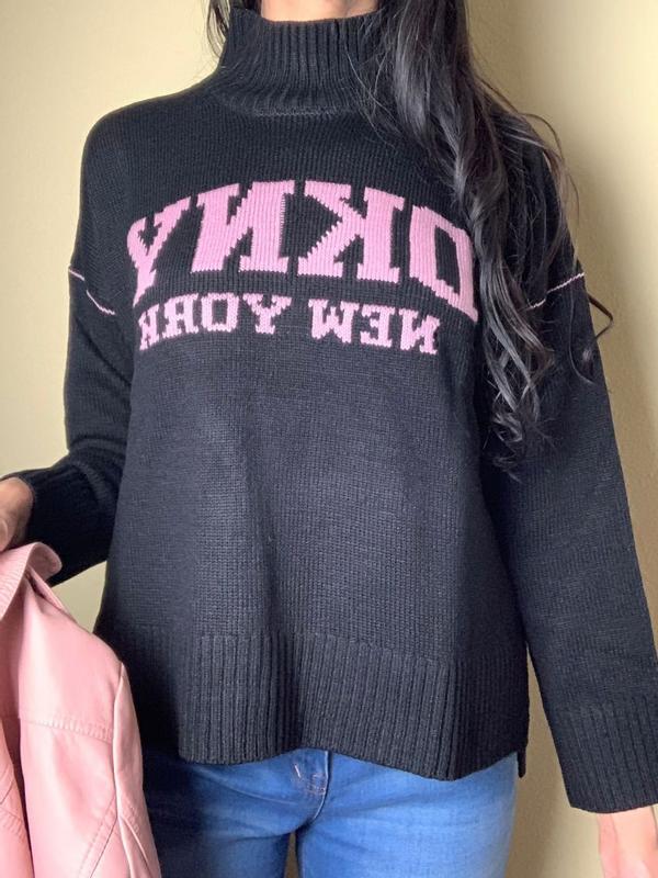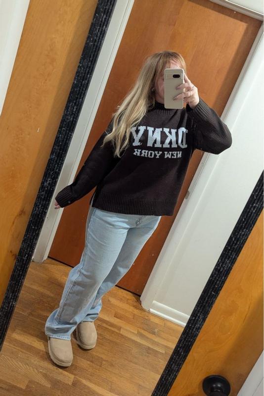 I'm really impressed with my new DKNY New York sweater! The black with pink lettering is super stylish, and I especially love the oversized look – it's so comfy and on-trend. It's also super cozy, which makes it perfect for lounging around the house or running errands. What I love most is how soft it is, even though it's 100% acrylic – it doesn't irritate my skin at all, which is a huge plus. The turtleneck is exactly what I was looking for because I don’t like to wear a scarf in the wintertime. The quality is top-notch, and it feels really durable, so I know I'll be wearing it for a long time. Plus, you can pair it with anything, from jeans to leggings to skirts! It's become my go-to for everything – perfect for Minnesota weather. If you're looking for a comfy and fashionable sweater, especially if you love the oversized style, I'd definitely recommend giving this one a try!