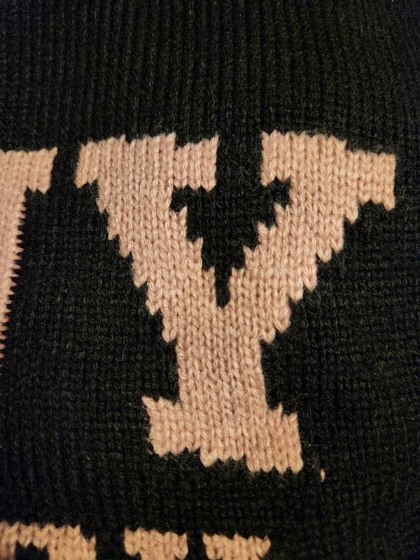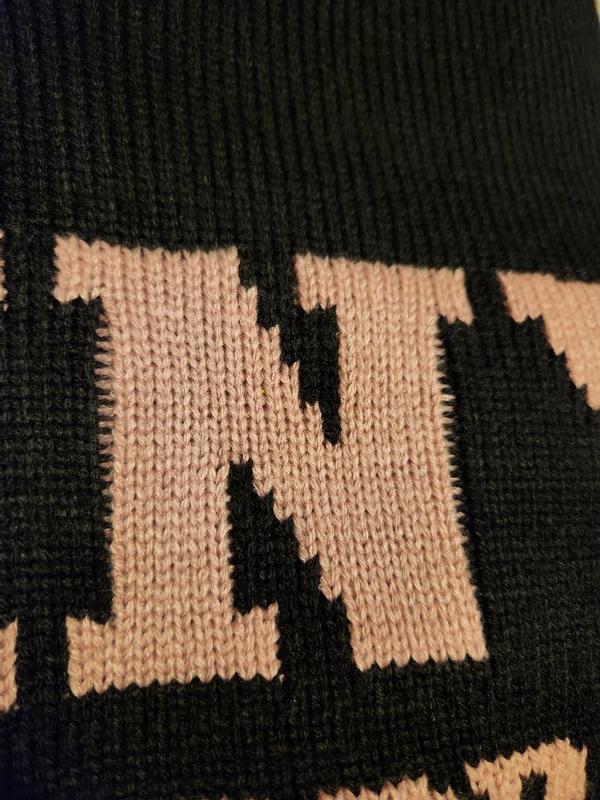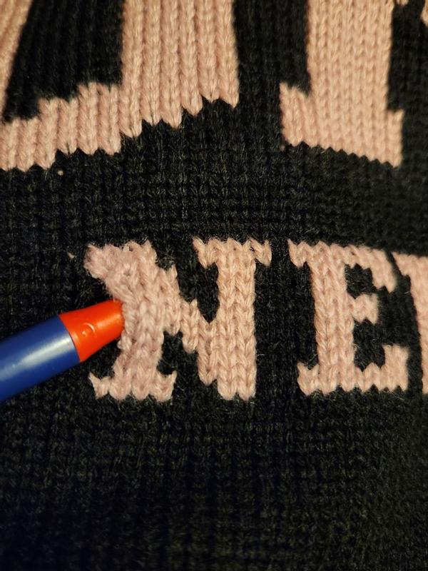 This black and dusty mauve sweater has a cool, minimalist look with its bold block-letter design. The high-low hem and boxy fit are nice touches, but the quality falls a bit short. More specifically, the letters aren't knitted very neatly. Some edges look either stretched or uneven and a few loose threads are visible, which makes the knitting look sloppy.