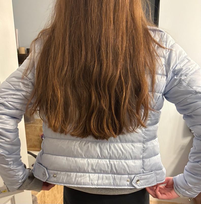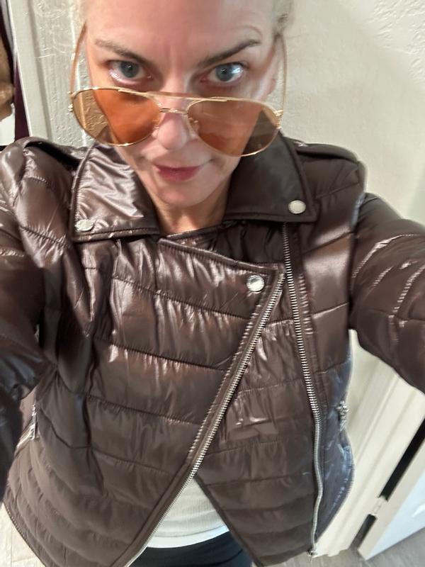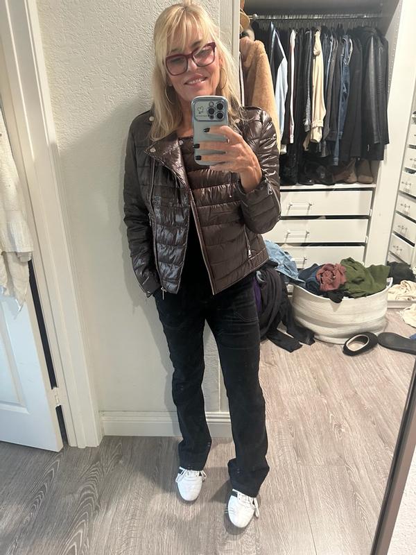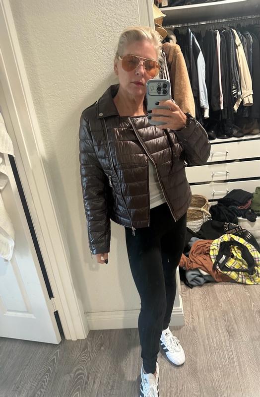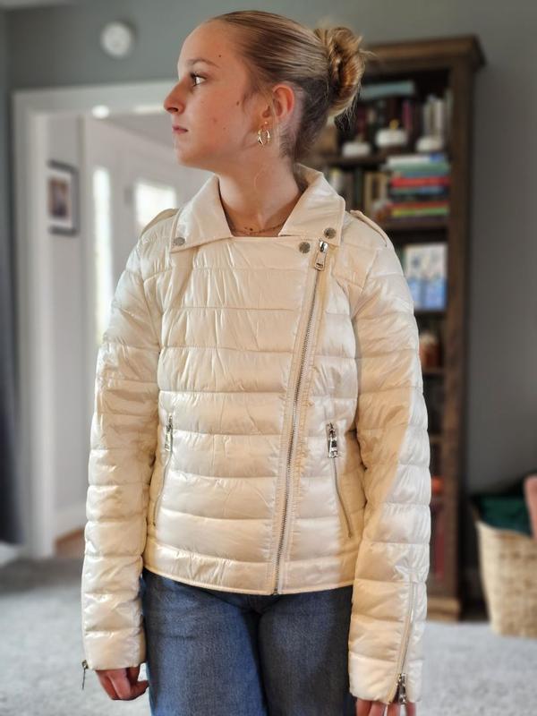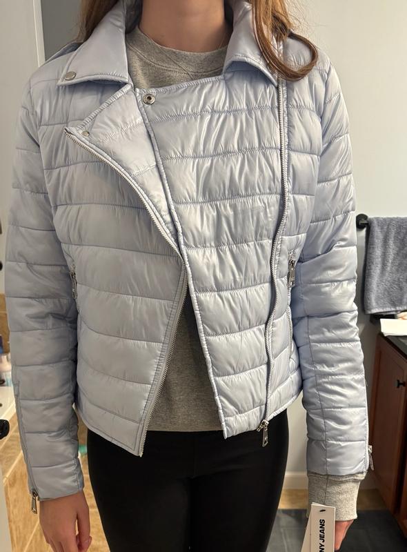 This is a cute play on a puffer coat/moto. It is just right for brisk days without being too bulky. The ice blue color is gorgeous and goes well with dark and lighter outfits. It is quite cropped on taller women or those with long torsos.