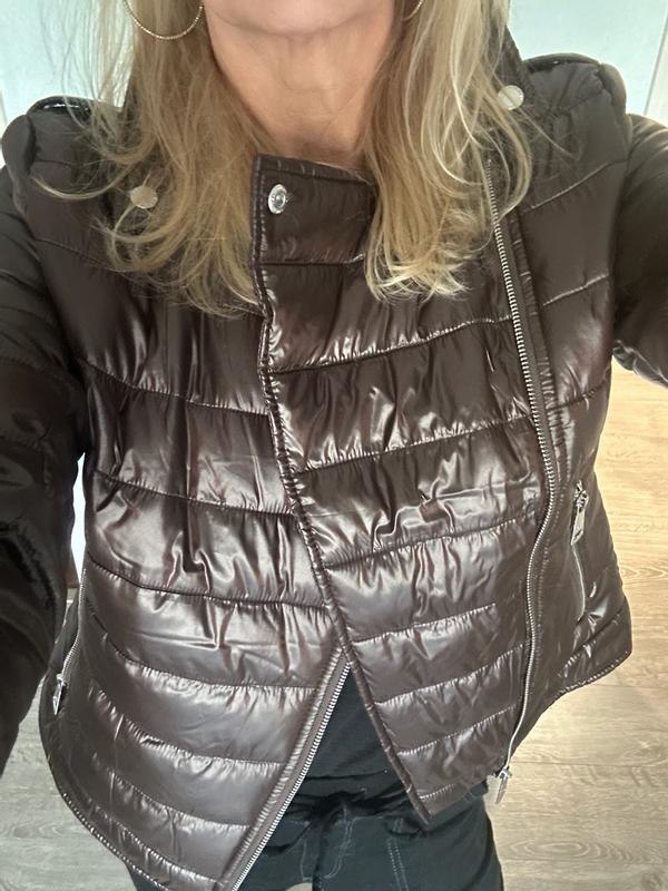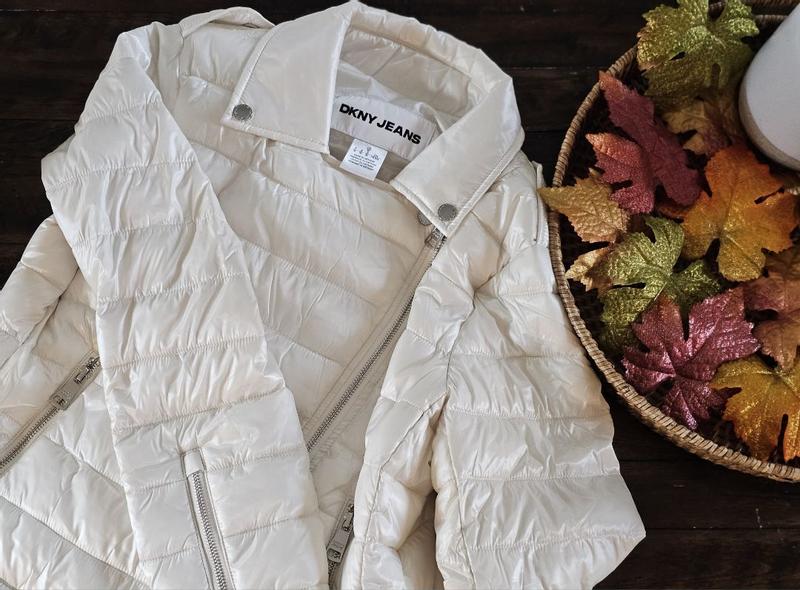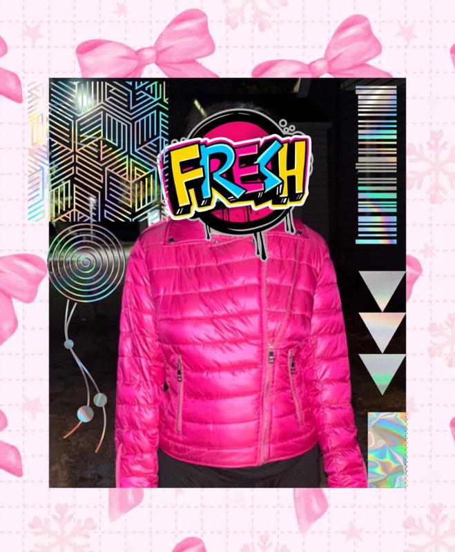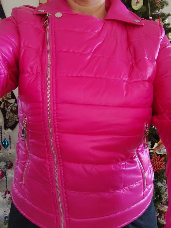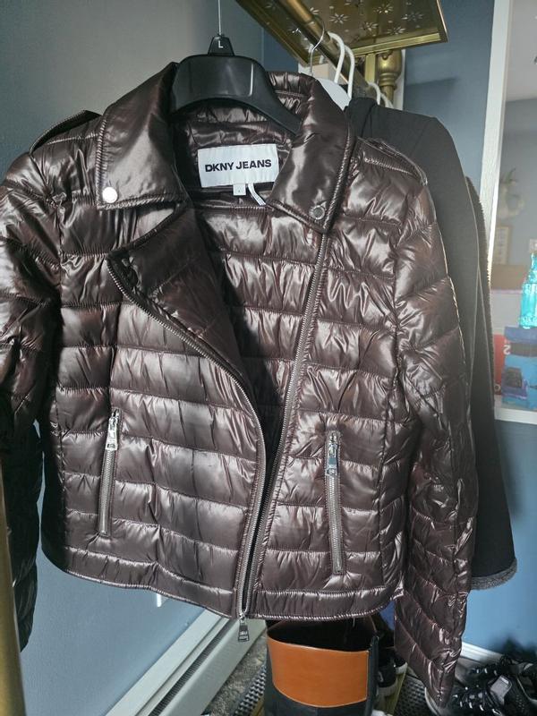 Y'all!! If 10 stars was an option, I would give this coat a 10. It was a little too small on me and didn't zip so I gave it to a family member who loved it (in the photo), but I did wear it unzipped for a few hours outside to get a good feel of its comfort, level of mobility, warmth and any matters of design etc.... I really like that it has the cut and look of a leather rockstar jacket from the 80s but it's actually a thin comfortable puffy jacket that feels like down and has the warmth of down (goose or down or blended feathers). DKNY always creates pieces that combine functionality with style and this piece from the 2025 Fall/Winter line is exactly that. Its warm and cozy but has a lovely cut that is stylish and in this hot pink it's definitely a WOW statement piece! If you live somewhere cold and want to feel warm whether on public Transit or outside walking or even jogging but still want to show your individual style and fashionable side, this is your best bet. The collar lays down very pretty when unzipped but if you zip it up you can stand it up and it will keep your neck warm. I like the zig-zag zipper stitch detail. The pockets are functional (enough). I can't recall the name of this style of cut for a coat but it's very flattering and slightly comes in at the waist. It isn't particularly "cinched" with elastic but it is seen where the waist part comes in for a flattering look to insinuate the waist. It's actually waterproof,which is great for snowy days or being caught in the rain. It dries fairly quick too. I don't really see any negative points as everything about this particular garment feels very thought out and with purpose. I would be interested to see if this "faux moto chic" style as I jokingly call it , will be available in a coat a bit longer to cover (even partially) the tushy, as it gets really cold in the Middle of the US and u prefer longer coats on those cold icy days....I would gladly buy this exact jacket though in a black and an emerald green ,if available.