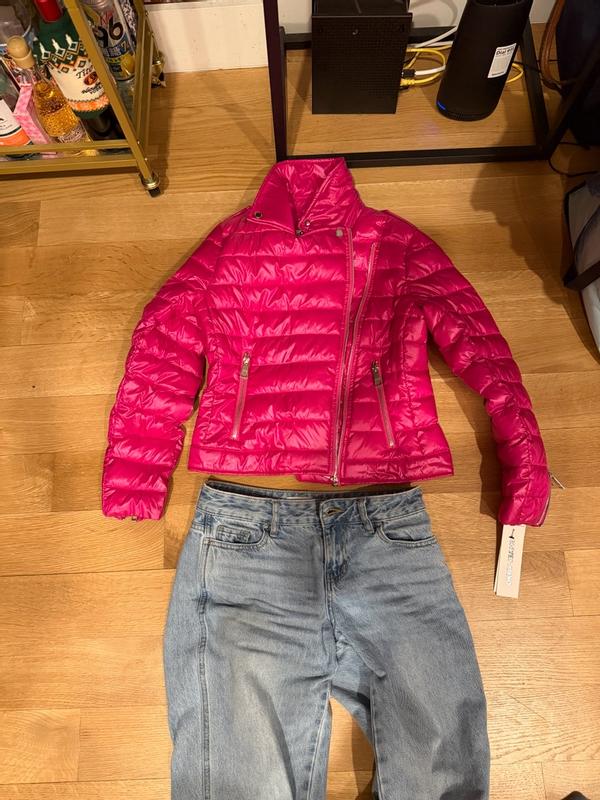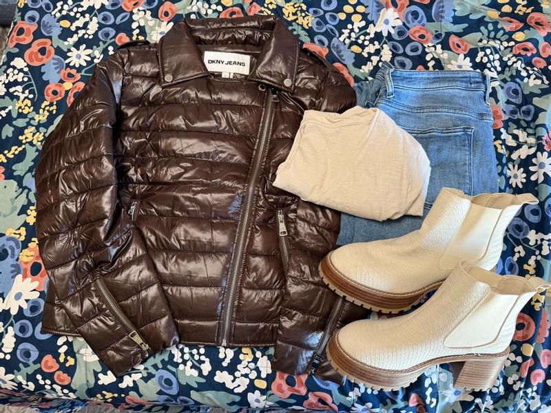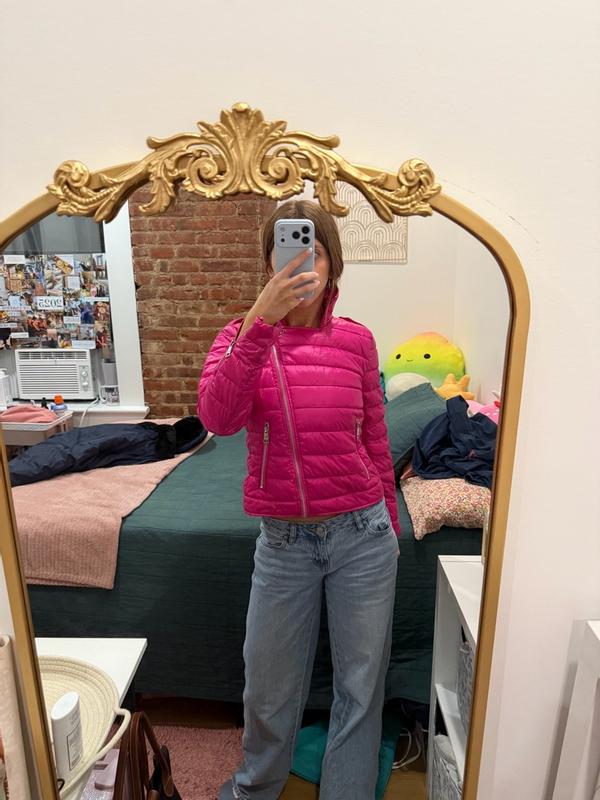 Light weight puffer is warm and stylish and has nice quality to it in the trim and seams. Great for the fall. Very light weight, but warm. It does run a bit small so it is better to size up, but I still love it.