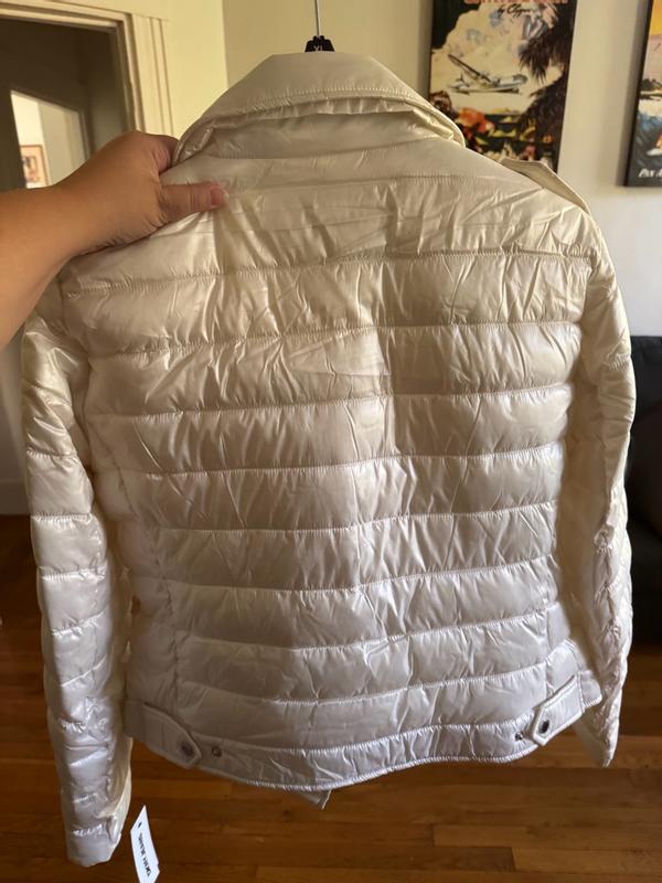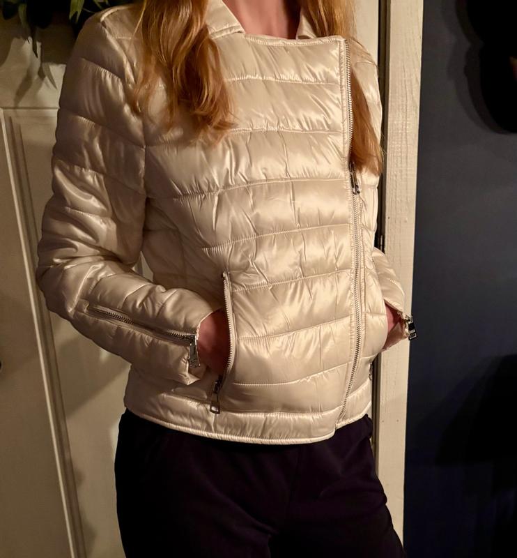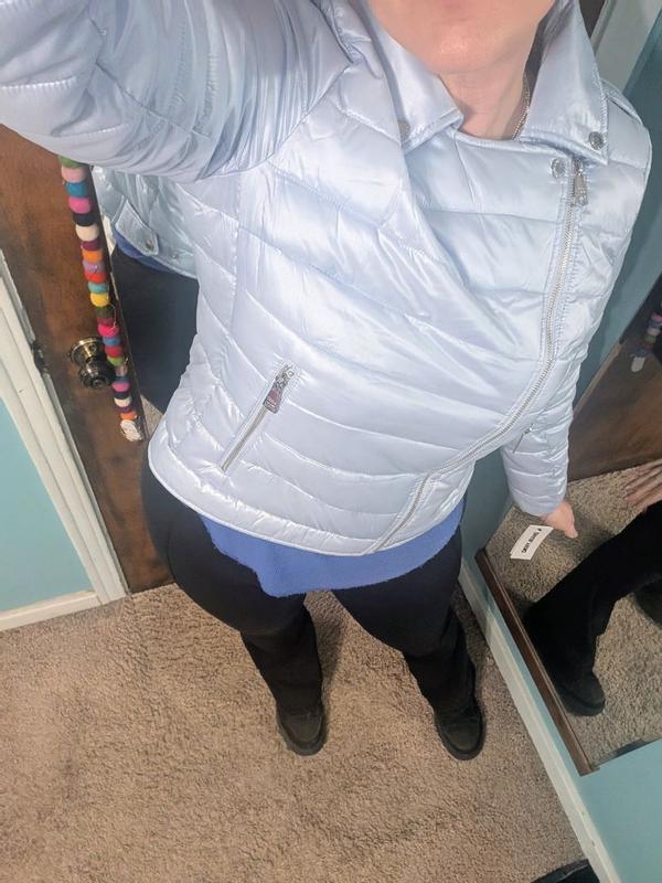 This jacket is super cute!! Very soft material, doesn't make noise when moving around like a normal puffer jacket. The subtle metallic in the blue is gorgeous. I like the asymmetrical zippers, it makes the coat more into part of the outfit as a whole.
