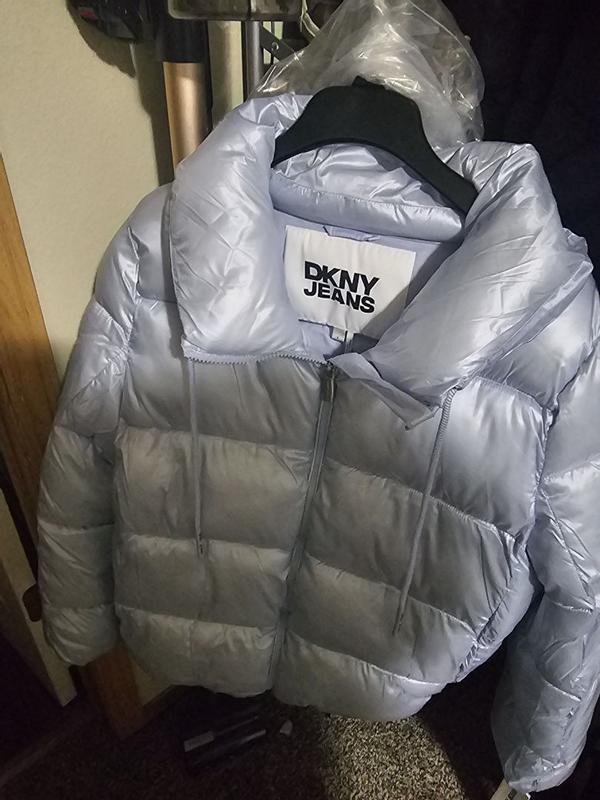 This DKNY Jeans light down jacket is a stylish and practical choice for chilly weather. The white metallic color gives it a sleek, fashion-forward look that stands out without being flashy. The fit is just right—not too long or bulky— making it easy to layer over everyday outfits. It’s lightweight yet warm, perfect for mild to moderately cold days. The down fill provides good insulation without feeling heavy, and the fabric feels durable enough for regular wear. Overall, it strikes a great balance between comfort, warmth, and urban style.