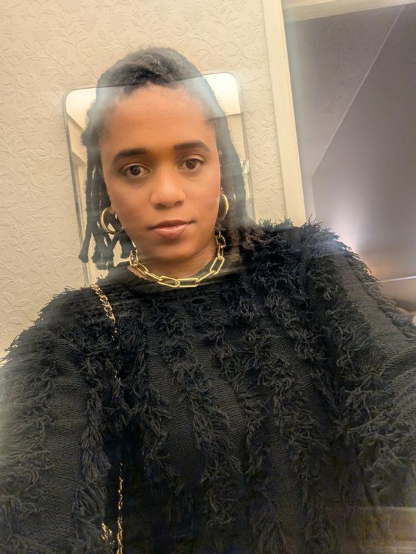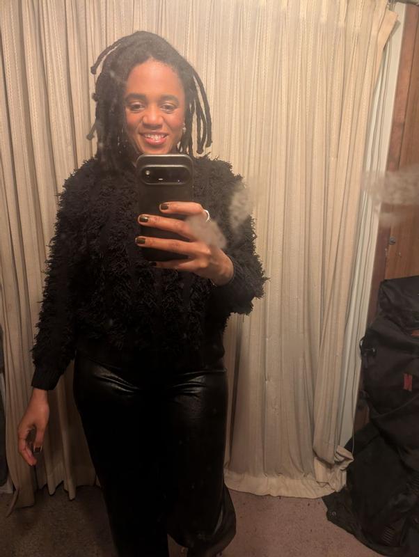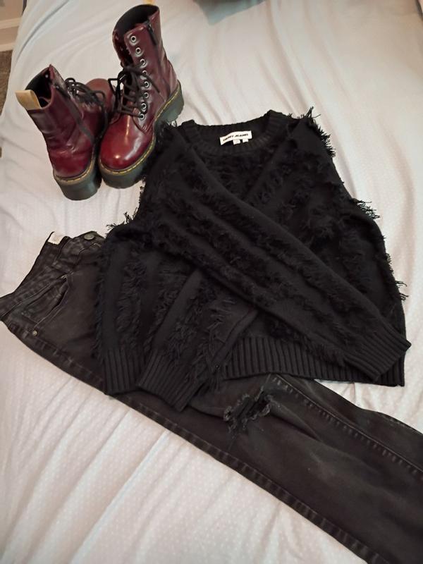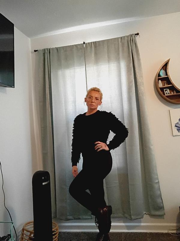 Okay, so this DKNY top had me feeling very “main character.” The fringe stitching is the star here. It gives the sweater texture without being itchy or over the top. It’s like… subtly dramatic. People will stare but in a “is she famous?” way, not in a “why is her shirt shedding?” way. Material-wise, it’s soft and cozy but not too warm. The inside feels smooth against the skin, so I wasn’t fighting with it all day or overheating. It has a good amount of stretch but still keeps its shape with no saggy elbows or weird stretching after wearing it. Fit is true to size, but it is a fitted silhouette. If you want it relaxed, size up. I loved how it hit right at the hips and paired perfectly with leggings and boots. Very easy “throw it on and look expensive” energy. My only tiny critique: the fringe texture can catch on jewelry if you’re wearing dangly bracelets or rings, so just keep that in mind. Otherwise, it’s a vibe. Would I wear it again? Absolutely. It’s comfy, unique without being loud, and makes a basic outfit look intentionally styled. 10/10 for effortlessly cool fall/winter outfits.