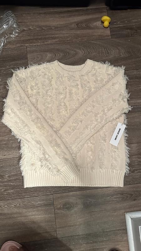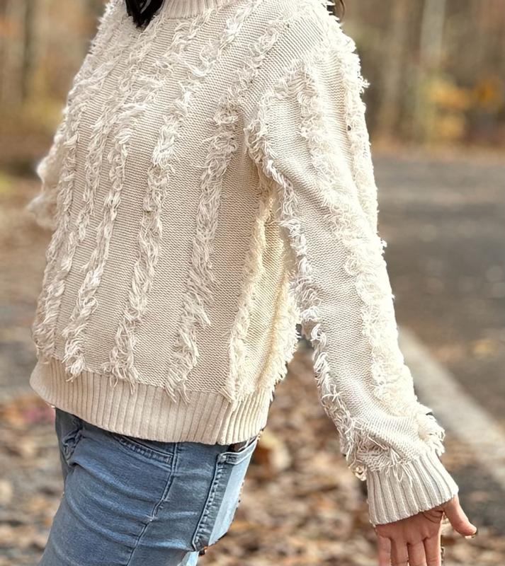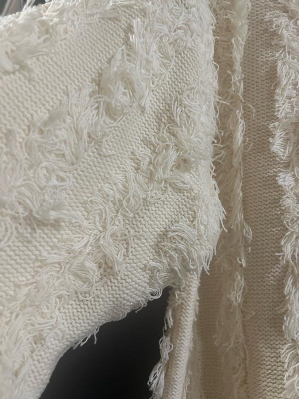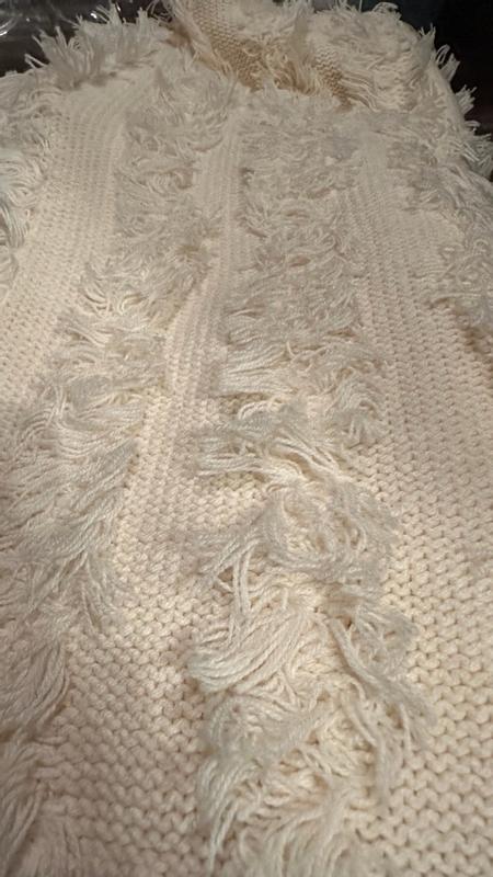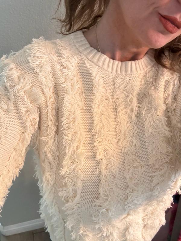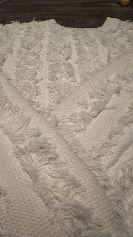 Classic cream color palette that adds a fun boho twist with the threaded fringe. Basic soft sweater material with a comfortable stretch for easy fitting. Really enjoy!