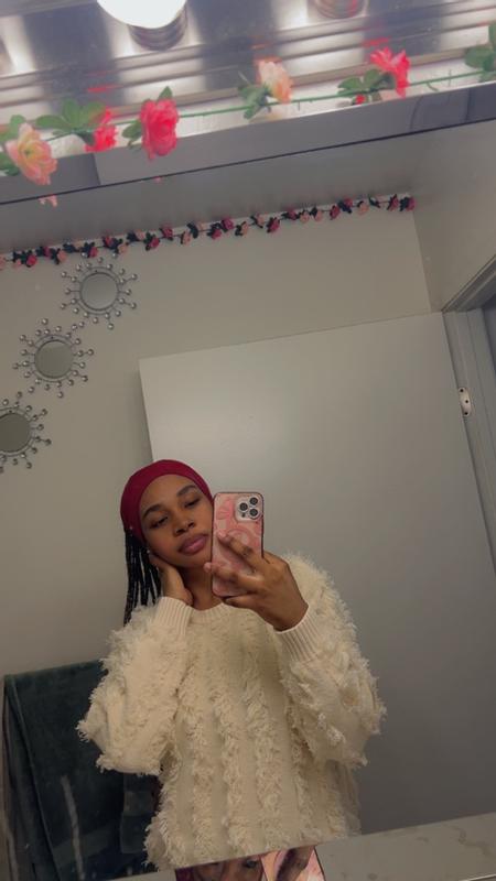 This sweater is beautiful and so cozy! The fringe is eye catching and a stunning addition! Its the perfect weight for fall and looks great with jeans or a pair of leggings.