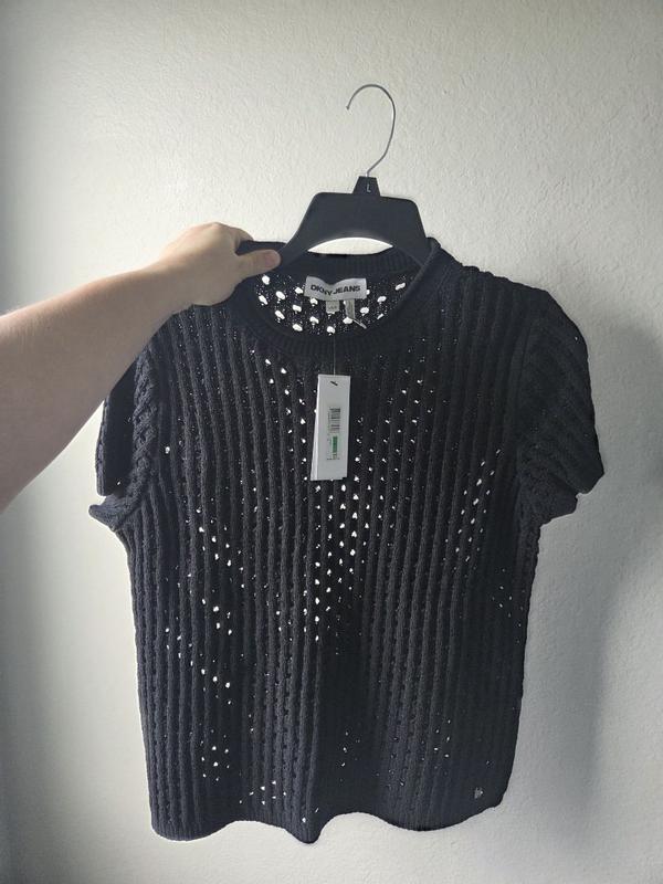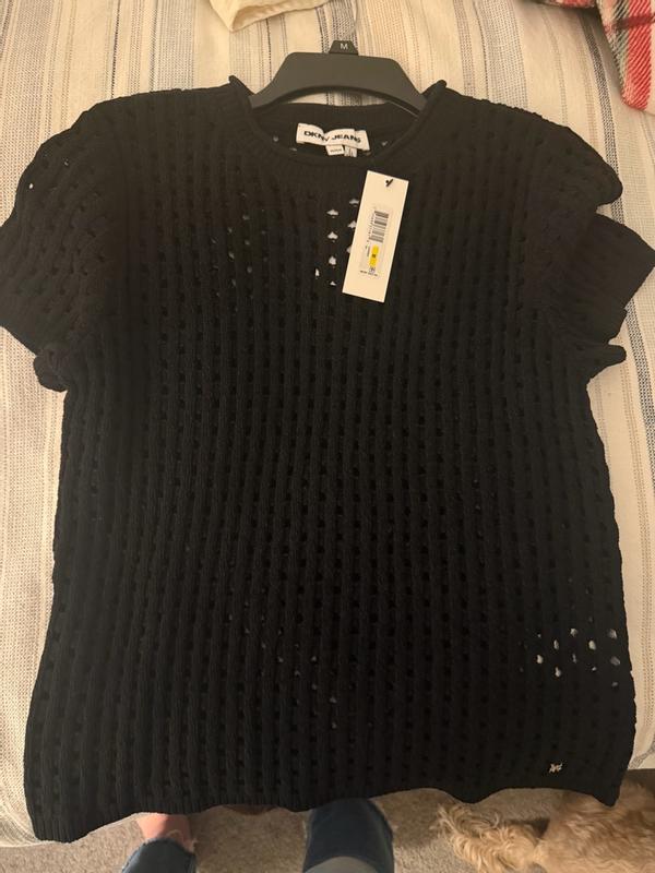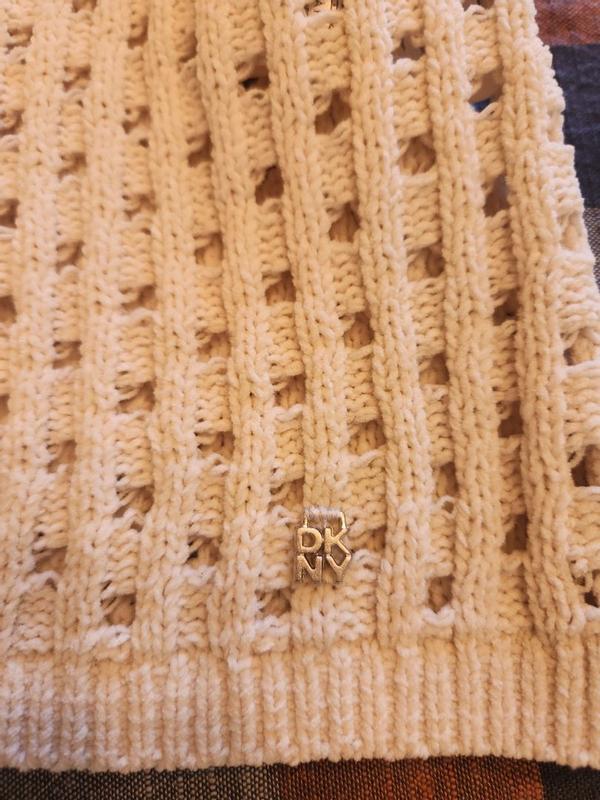 DNKY brand sweater. This beautiful sweater is a beautiful beige color with short sleeves. The material is super soft and has a lovely woven design.