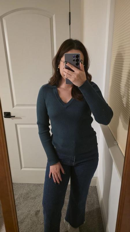 This is a great sweater! It’s ribbed and fitted but also has stretch to it. The sleeves are really long which I like, especially when it’s cold out. The fabric quality is really nice too. It fits true to size. The seams are not skewed at all after washing which is excellent. It truly is great quality. I highly recommend if you are looking for a sweater like this.
