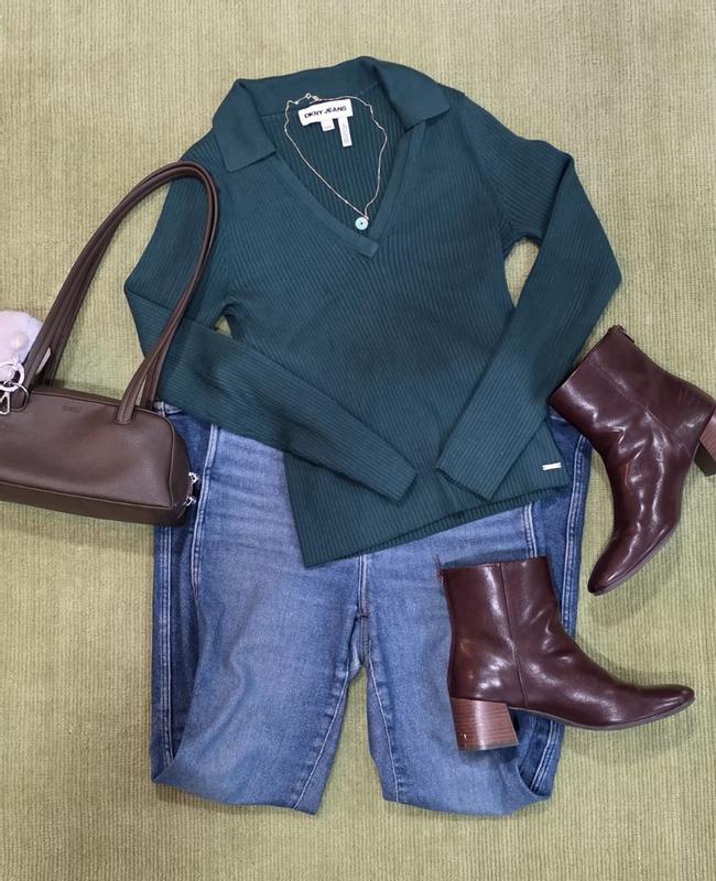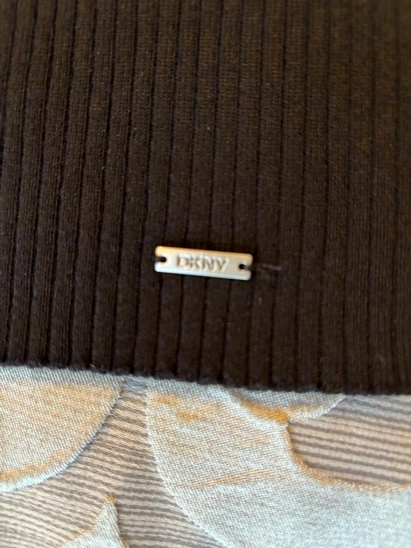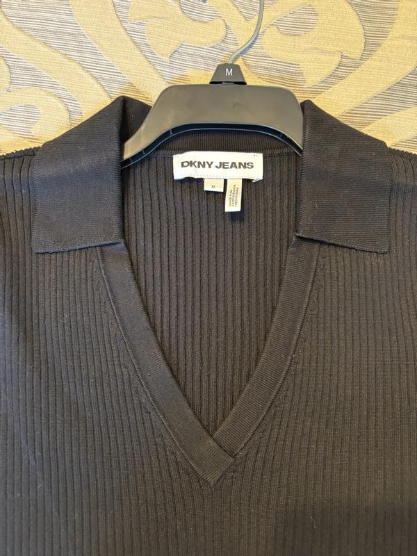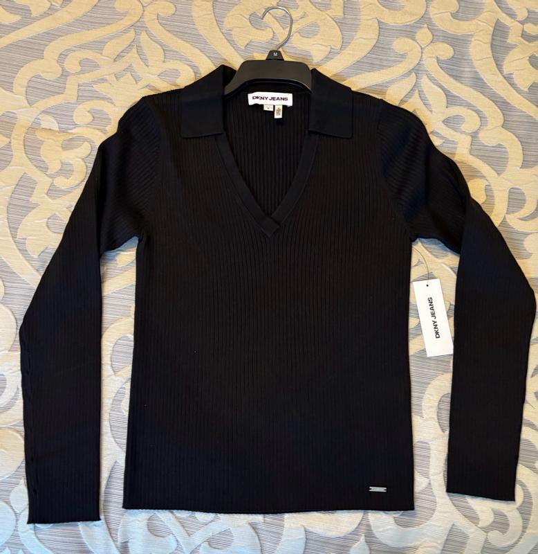 DKNY lightweight sweater with great quality. Ribbed and not uncomfortably tight. Washes well with no pilling. Black soft material that goes with anything.