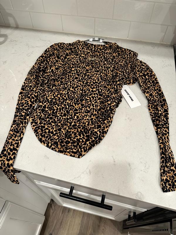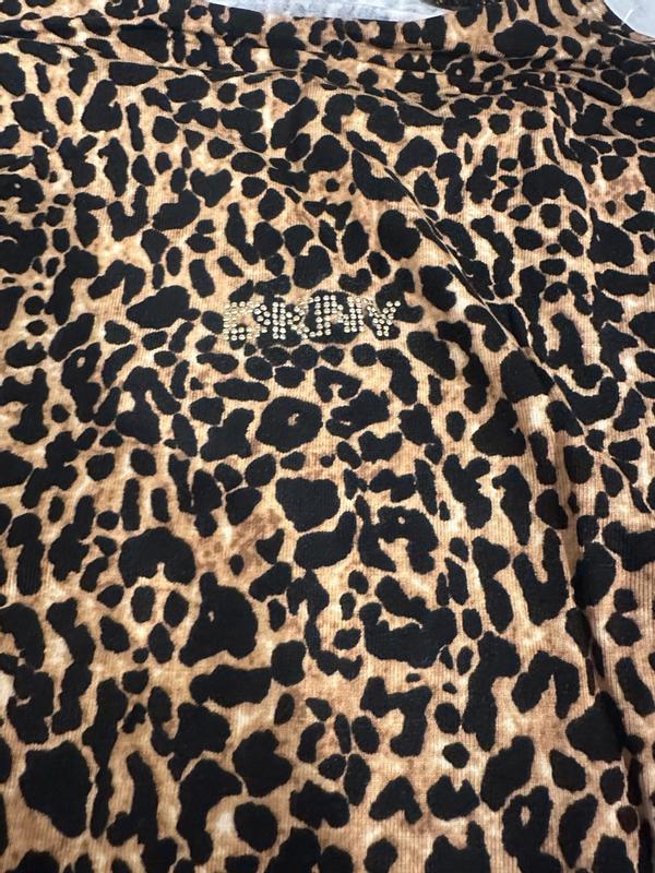 This shirt is super cute! I love the leopard print and the gold detailing of DKNY on the front, the ruching, and how lightweight it is (perfect for layering). This shirt is 94% rayon and 6% spandex so it fits a bit tighter, and the neck hole seems extremely small, which I wasn’t expecting. The sleeves are a good length (for reference I am 5‘7“) and they hit in just the right place on my wrists. I normally wear between a small and medium and chose a small in this particular shirt and it was a bit snug for my liking (139 pounds). Overall, though, I think it’s a great shirt!