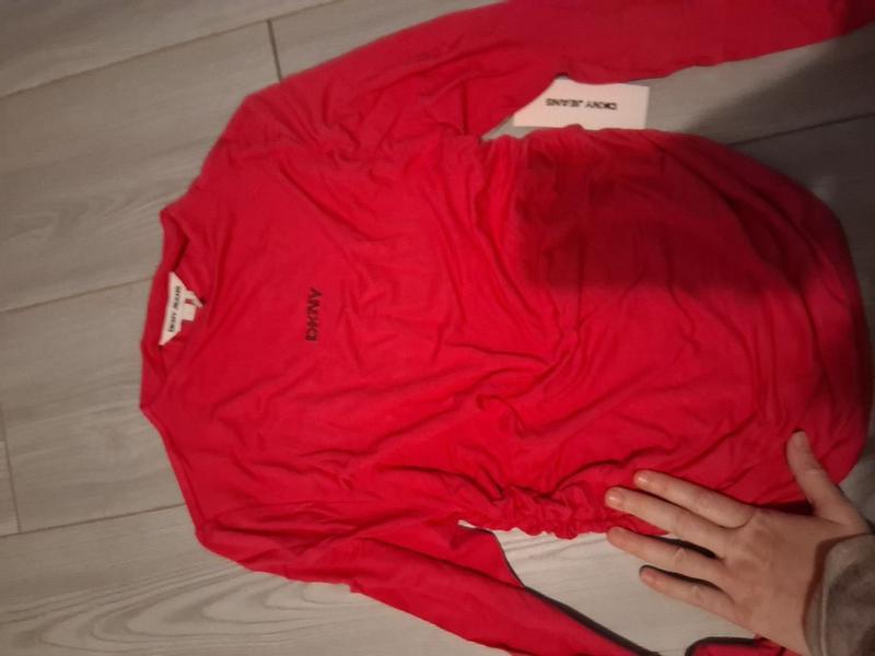 Love this DKNY long-sleeve top! The red color is bold and beautiful, and the high crew neck gives it a classy look. The studded logo adds just the right touch of sparkle. It fits well, feels comfy, and works great for both casual and dressy outfits. Definitely a new favorite in my closet! The only con is it wrinkles easy.