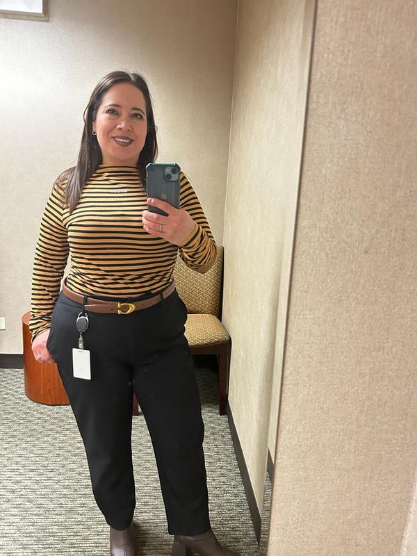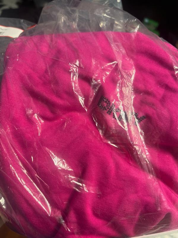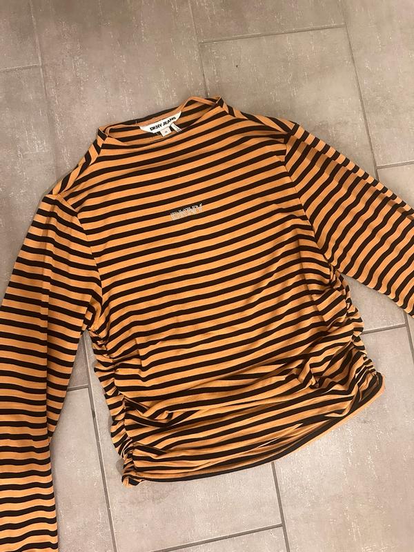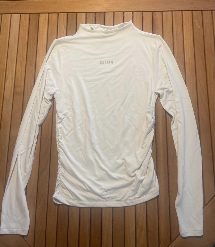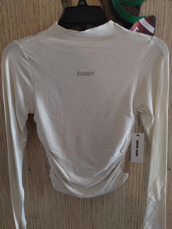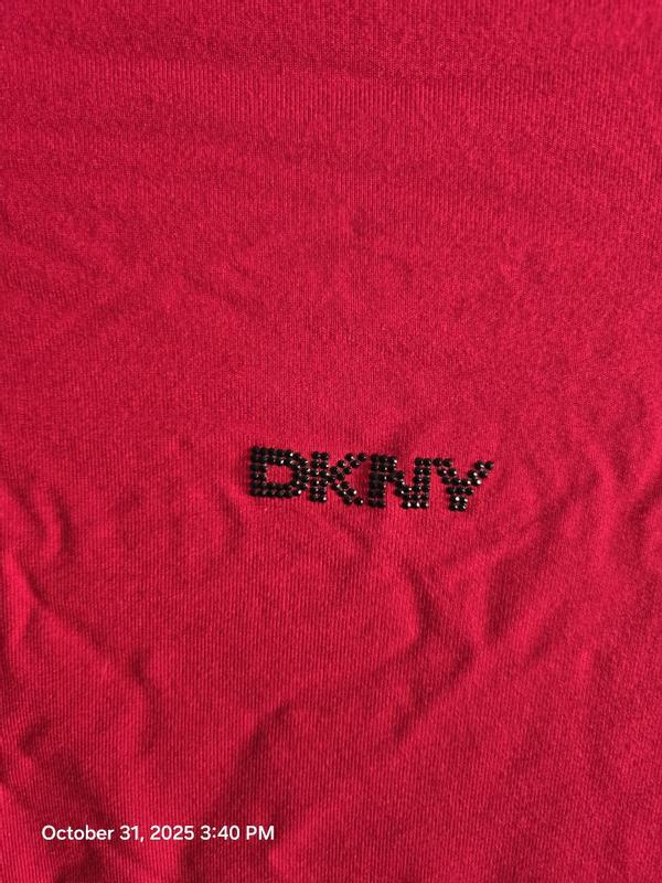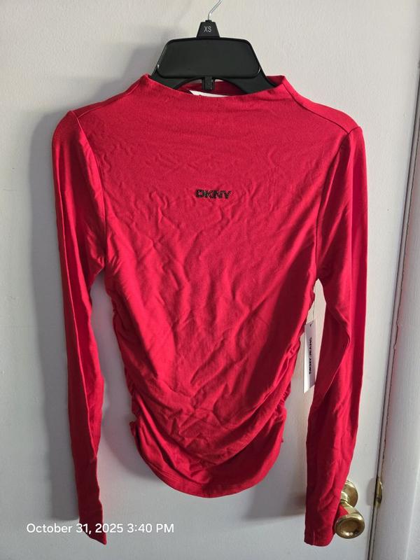 Love this DKNY long-sleeve top! The red color is bold and beautiful, and the high crew neck gives it a classy look. The studded logo adds just the right touch of sparkle. It fits well, feels comfy, and works great for both casual and dressy outfits. Definitely a new favorite in my closet! The only con is it wrinkles easy.