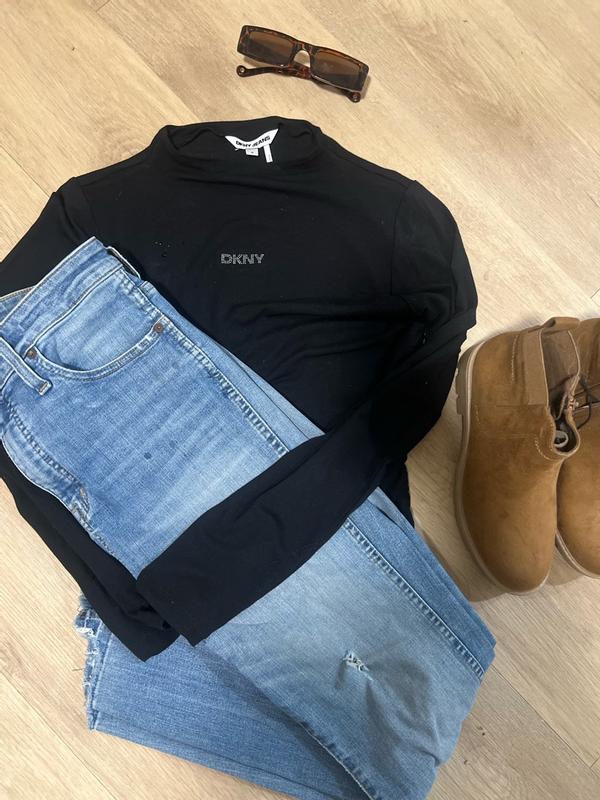 DKNY JeansWomen's Side Ruched High Neck Long Sleeve Top With Rhinestud Logo