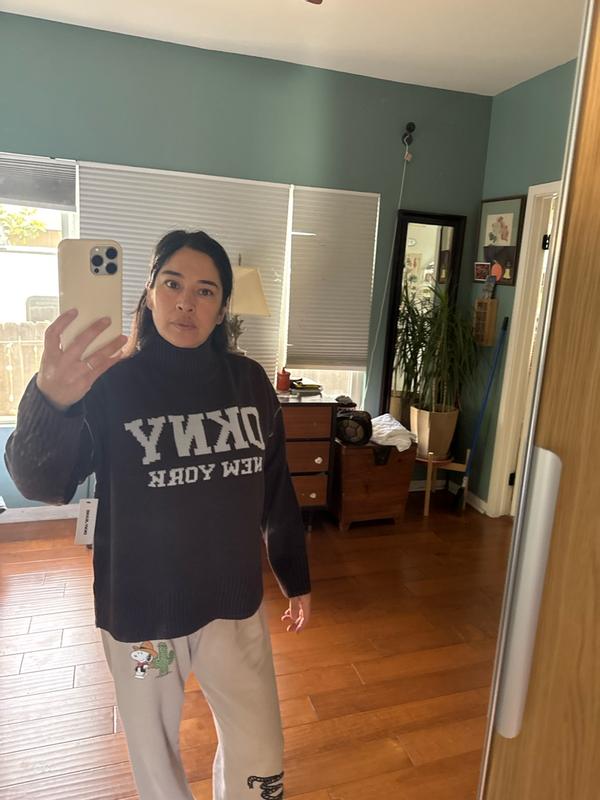 The article of clothing is not what is shown on the photo that the website provided on the photo it shows a striped thin turtleneck and this happens to be a thick knitted sweater with a big DKNY logo I would have liked to gotten the photo item that was presented to me, but if I was to go out and buy this, I probably would not the style is something I would wear, but I just would not wear such a big logo. The sizing is very comfortable and not overly big and it looks like it would be durable in the winter. The style is a little bitover the top for me with the logo being so big.