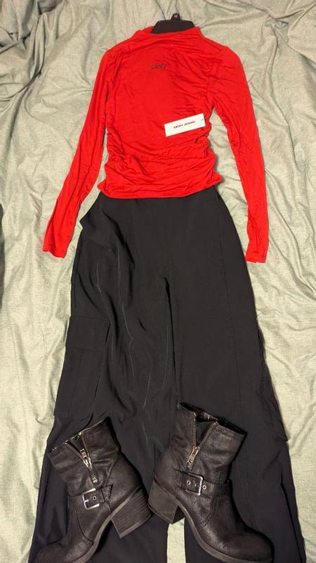 This is a lightweight, side ruched DKNY red shirt. It feels very soft and is just a little bit smaller than expected, but it still fits well. I paired it with my parachute pants and also a black skirt with white flowers, mid calf. Both times I wore the black boots with them and this shirt looked really cute with them.