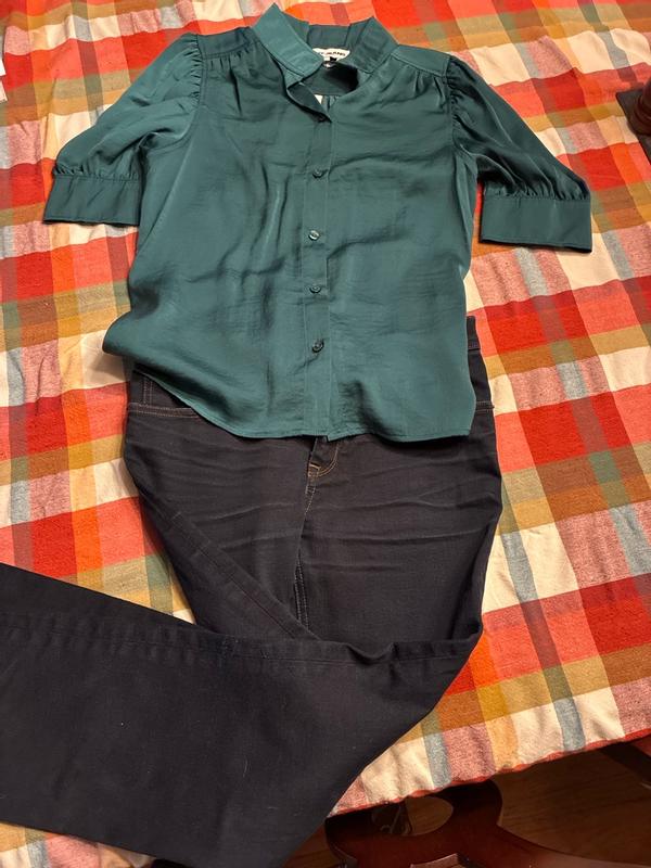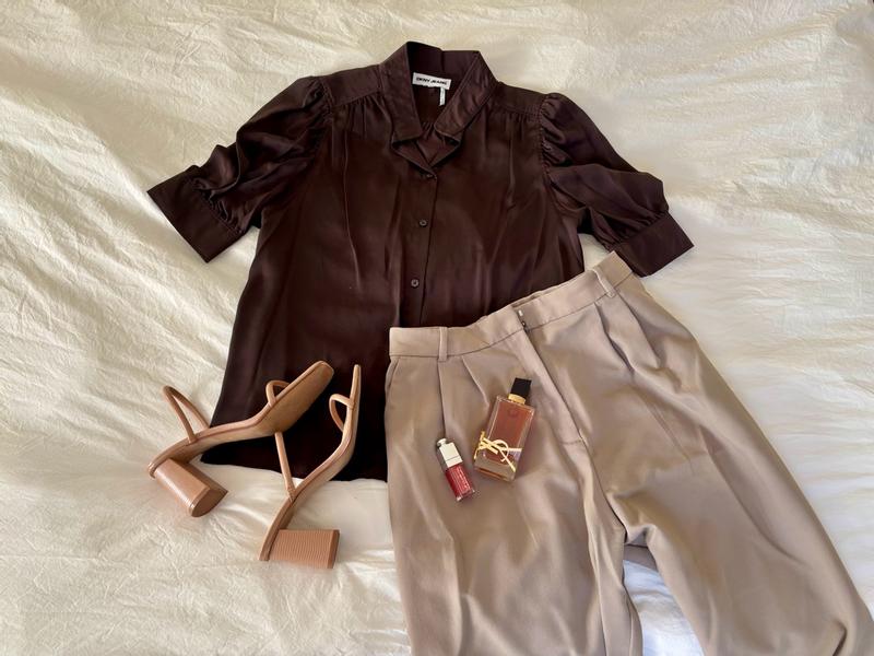 This shirt is the perfect silky chocolate brown - I love the subtle puffed sleeve and how light in weight it is. Styling it tucked into some tan trousers for a slick monochrome look for work but the possibilities are endless!
