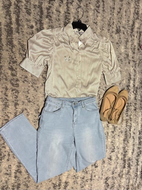 I loved this blouse from DKNY Jeans; the fabric feels soft, lightweight, and fresh on the skin, giving the impression of being a durable, high-quality material. It’s easy to care for, machine washable, and can be steamed without any issues, which makes it very practical for everyday wear. The style and cut are flattering and elegant, and it fit me perfectly in my usual size. The only thing to note is that the arm area may feel a bit snug for those with fuller arms, but it can be easily adjusted thanks to the adjustable buttons. Overall, it’s a comfortable, versatile, and sophisticated piece that has definitely become one of my favorite items to wear this season.