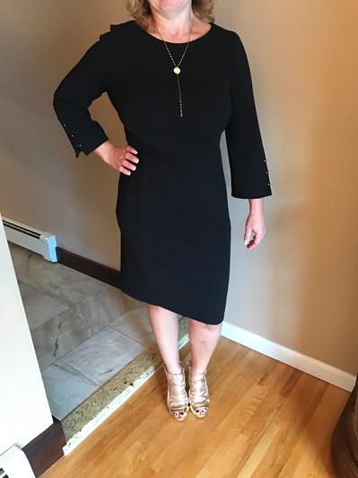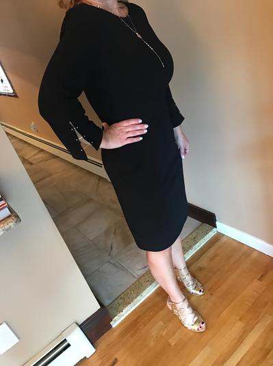 This DKNY dress is a comfortable black dress that you could wear on any dressy occasion. The detail on the sleeves with the little gold "slide" buttons adds a beautiful updated touch. This dress is very comfortable and I actually could wear a size smaller than I normally run.