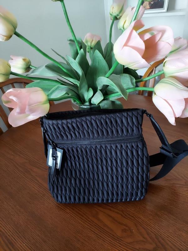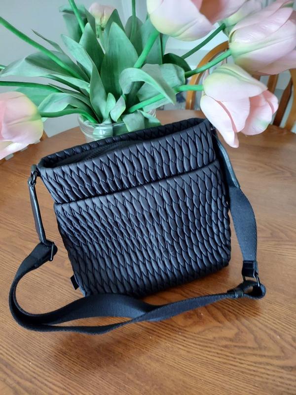 I get many compliments about this bag, which is basic with pockets inside and out, zippers, and a strap. What really makes this bag special is a low sheen nylon textured exterior, which is so different, elevating a great, easy-to-carry and use construction into something more stylish.