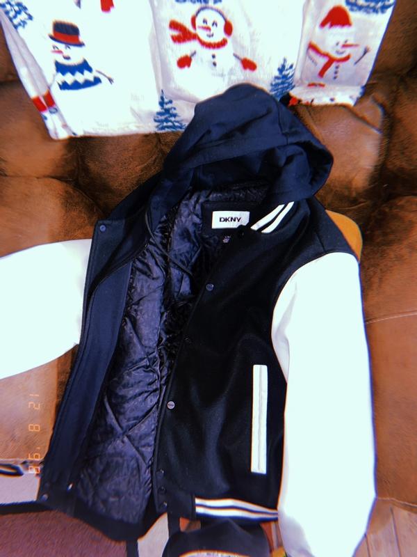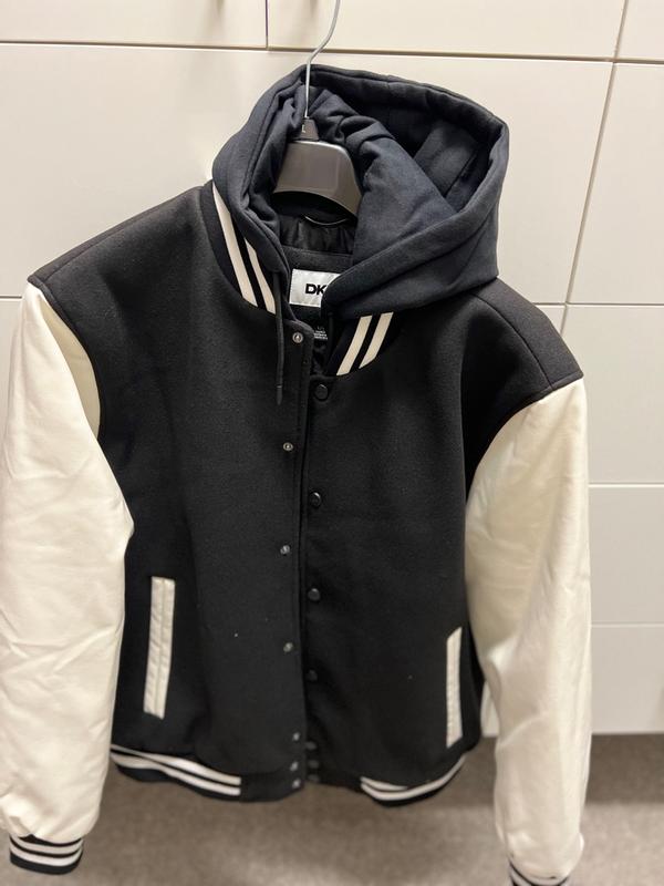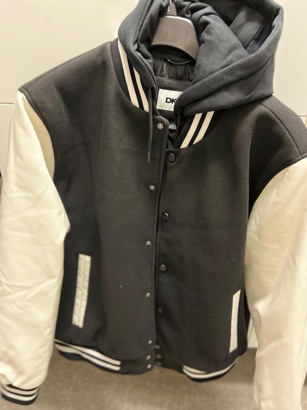 DKNY Jacket When I first saw this jacket, I thought it was a bomber jacket but I guess in reality it’s a varsity one because of the detachable hood and bib, you learn something new everyday. The fit is like a bomber jacket though and it sits just below your waist. For reference, I am 6’2, 205lbs athletic build and this fits perfectly even on the arms. In terms of features, this has the detachable hood and bib, front pockets (for your hands), zipper and button closure (looks neat), interior pocket and quilted lining. I wore this for a concert inside a venue for which I had to walk over 1 mile in cold weather (35 F), I was wearing a T-Shirt under this jacket and jeans and I never felt cold, what’s more, during the walk I had to unzip it because let me tell you, this is pretty warm, you wouldn’t tell by looking at it but the combination of the hoodie and the jacket makes this pretty warm and as you can expect, it’s not very breathable as it’s not meant to be anyway. Looks are relative and although I can imagine a young man wearing this, I wore this at age 46 with some sneakers and the fit was great, I got compliments on it from various people we met. Fit, this is comfortable but it’s not light so take that in consideration as well. you can remove the hood but honestly I like how it looks and how it feels with the hood still attached. All in all, this is a cool jacket that I’ll pull out when the temperature outside gets pretty cold and I’ll use it for going to dinner, etc.