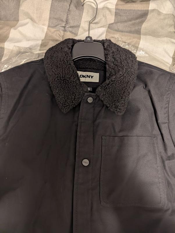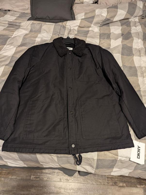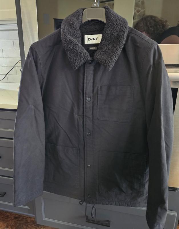 This DKNY fleece-lined jacket is sleek and stylish. It looks great while on, and keeps me warm. I love the easy snap buttons and the durability of which the jacket feels. The size is spot on. This jacket is made to look great, but also provide maximum comfortability.