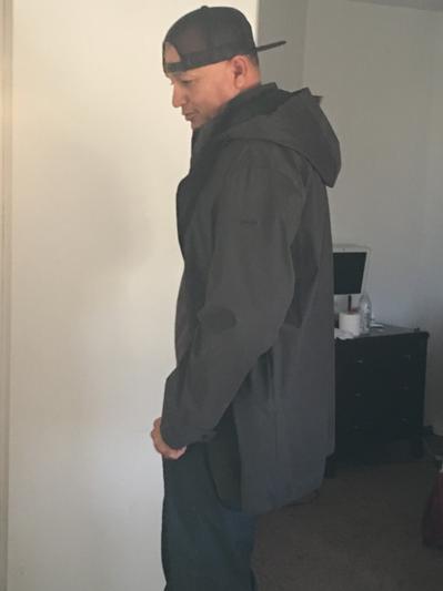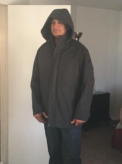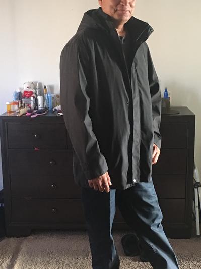 This jacket is very roomy and comfortable. It will keep you warm in the rain, sleet or snow, & water repellent. I love that it comes attached with a hood.