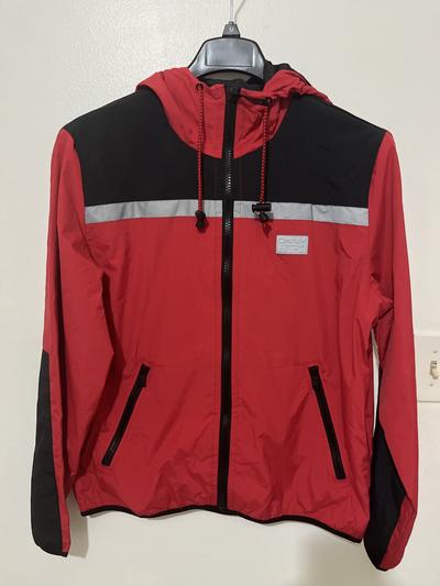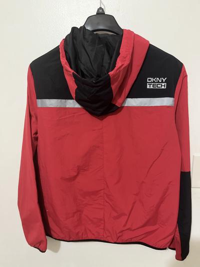 This jacket resembles a wind breaker style jacket. It has a hood so if worn on chilly rainy days it will keep you dry and warm. The color I chose is red and it has some black details on the outside. It has a small DKNY logo on the left side lapel area. The jacket has reflecting lines that when used at night can possibly be identified by others. It's not particularly warm but for Spring outdoor activities such as hiking, fishing, biking, walking and jogging would be sufficient coverage. It has one pocket on each side with a zipper which is what I look for in a jacket to secure my phone or wallet in. I'm satisfied with this jacket and its aesthetic.