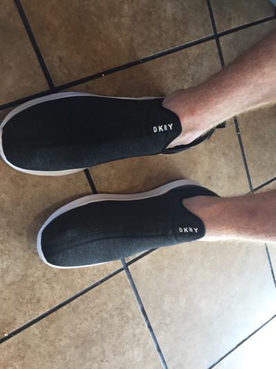These are very stylish with the leather-like trim on the back of the shoe and the DKNY letters on the "tongue" area. The insole is comfortable, but the back of the shoe is hard and makes them uncomfortable to walk in. They run very large, so definitely size down.
