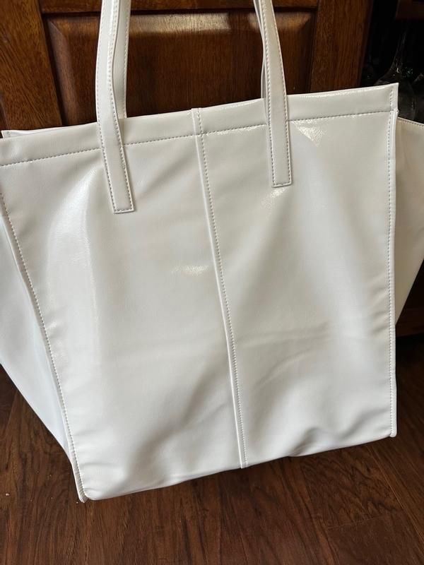 i was so excited when i was able to pick this out! i was definitely not disappointed, it is HUGE. it has a lot of space and a couple of other pockets on the sides inside. the handles feel sturdy and the hardware doesn’t look cheap. it’s like a soft leather feel so hopefully it holds up in the rain and the poolside/beach. only thing is the top zipper is awkward with it being either too long or too short depending on if you have the sides tucked in or out but definitely still a good possibly day bag/weekend bag/beach or pool bag/picnic bag