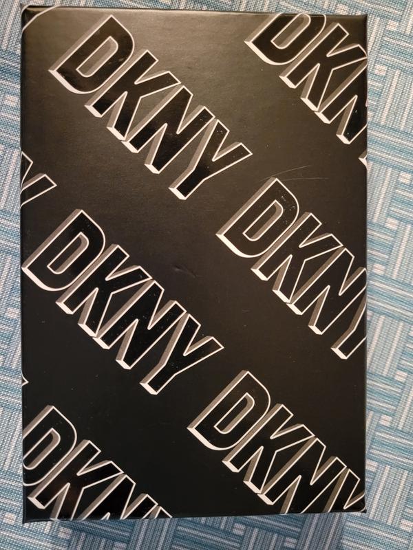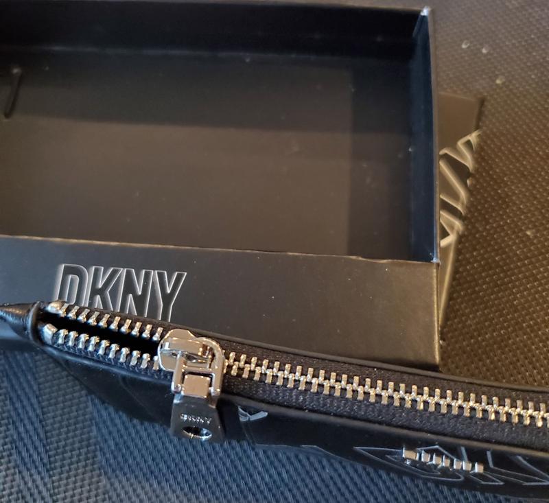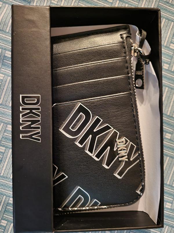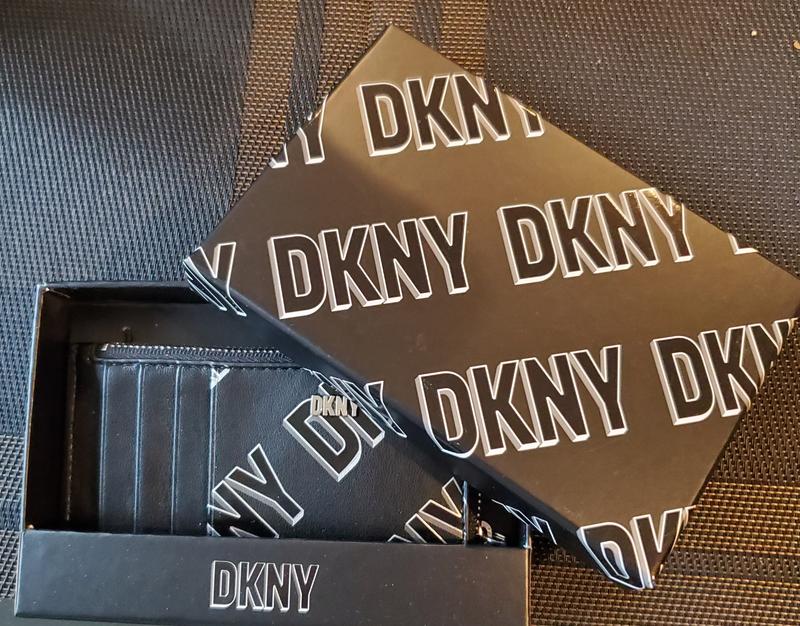 Really nice gift box and cute wallet. A little tight but will break in after use. Goes well with my DKNY purses and decor. Has a small strap but can connect so its not lost in your purse. I got the black and white so it matches my DKNY workout pants when i cant carry my purse.