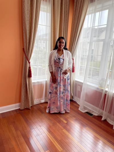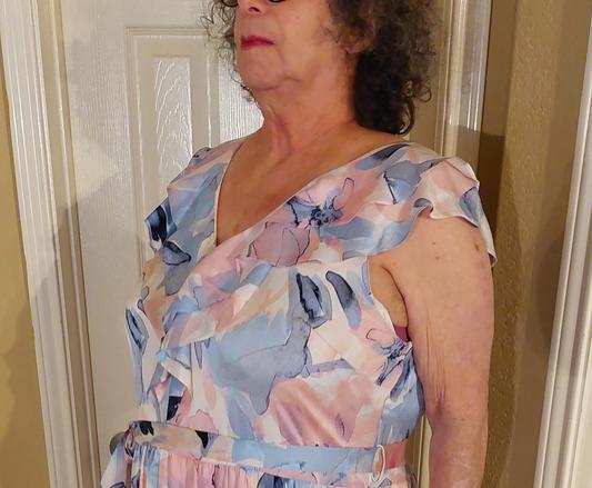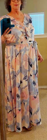 The dress is so pretty with the ruffle neckline and the tie waist. It's a beautiful, light spring maxi dress and it looks beautiful on.