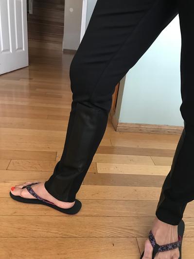 The touch of "leather" just adds a bit of class to these comfortable, stretchy pants. They are not skin-tight unless you order them smaller but I like that they hug without being uncomfortable. They are pants so they are looser below the knee than some skinny pants. They've got back pockets and a bit of "leather" around the top and over the bottom of inside seams. I've gotten compliments whenever I've worn them.