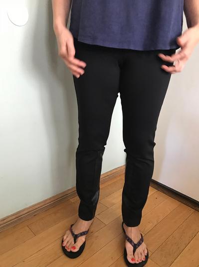 I got these pants for my 28 year old cousin. She is tall and slender. She loves these pants. The fit is great, fitted, without being too tight. Super stylish comfortable knit pants with a few faux leather accents. The finish on these pants is great - top quality. These pants fall above her ankle, so she paired them with some cute boots.