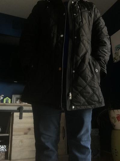 Great quality, long middle weight quilted jacket for Fall, Winter and into Spring. I’m 5’5”, 120lbs. I got the medium and has some room for sweaters but not too big that I can where tops too. It’s length hits me about 6 inches above my knee. I love the internal draw strings to give it a fitted look if I want. It zips and buttons which is great too! I has one internal pocket for a phone etc. The outer pockets are large but don’t zip or snap close (snap is just on outside for show). Best part is that the hood is removable with a zipper! Definitely happy with coat!
