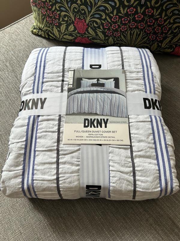 The set includes a comforter and two pillow shams. The duvet is great for summer with its 100% cotton fabric it is durable and has the seersucker look throughout the top and a light polyester fill. The comforter is soft and warm. The design is White, Black, Blue stripes. This is a very nice-looking bed set and made my bedroom look elegant. I have a queen size bed, and it hangs on each side. Leaving plenty of room.