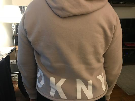 I got this DKNY hoodie in dune. My daughter opened the package and was in love with the color it is a light soft pink. I got it in size Medium, it is cropped hoodie fit very well with leggings or jeans. Very warm and comfortable but my daughter did not like the fuzz left on her sport bra when she took it off. I recommend this cozy DKNY cute hoodie. Very stylish and great color.