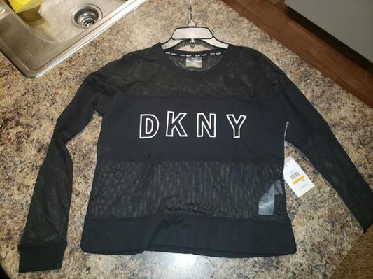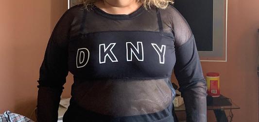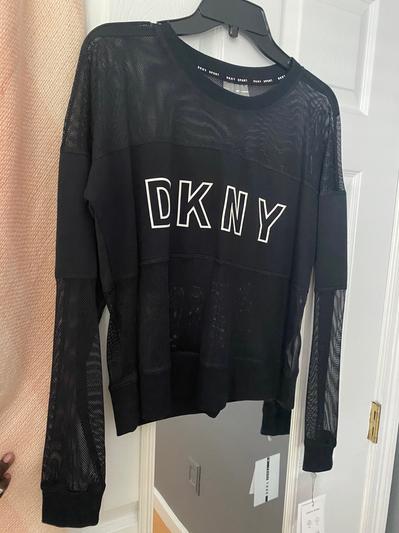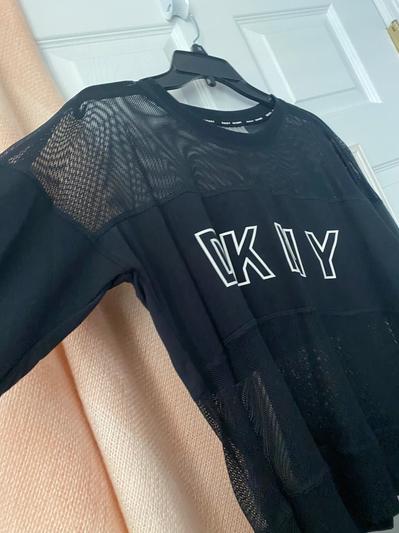 This is a cute workout top. The DKNY logo is only on the front of it. The mesh part of it does not irritate your skin, All around it's pretty comfortable.