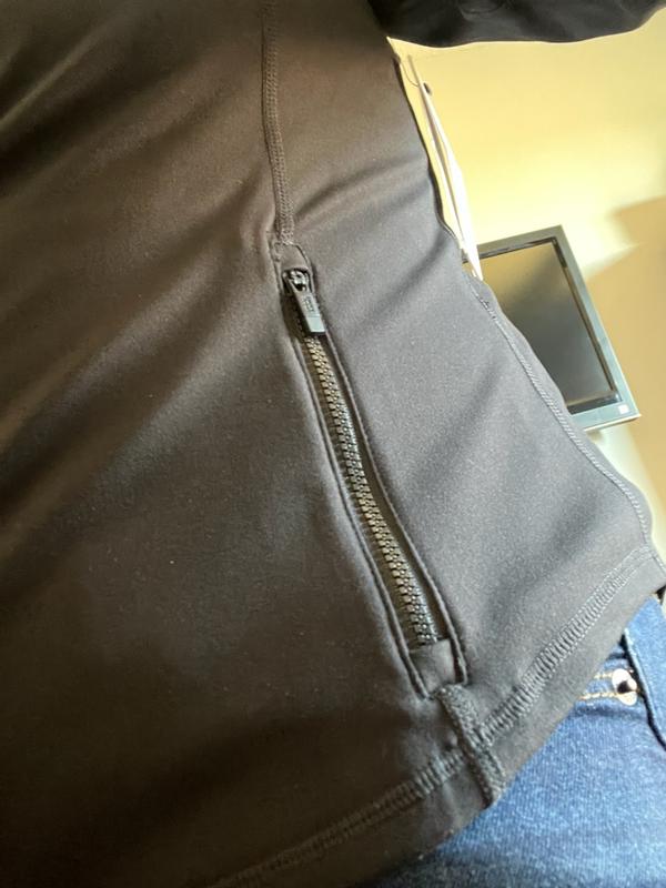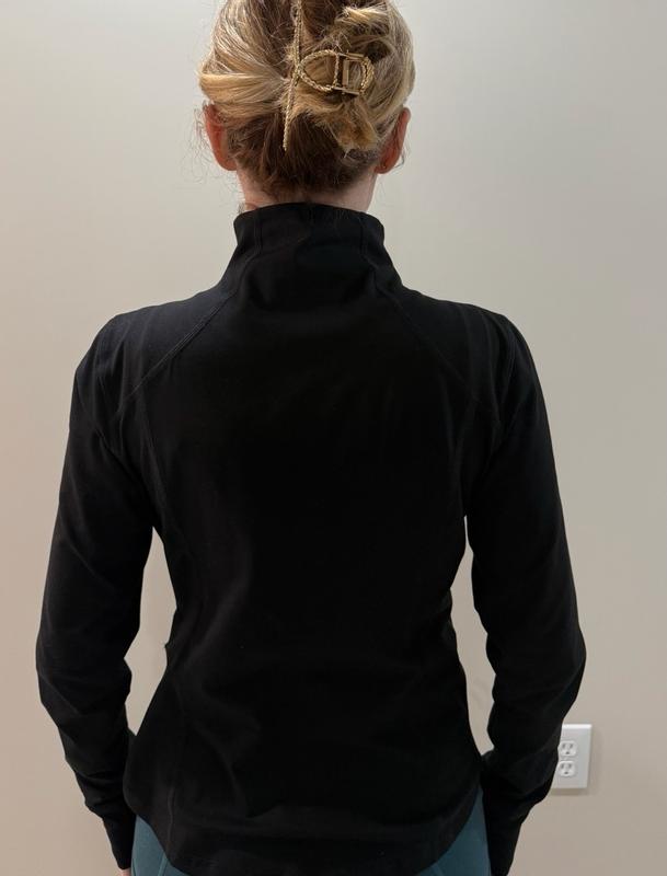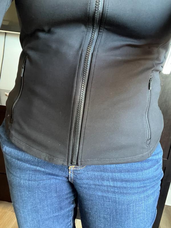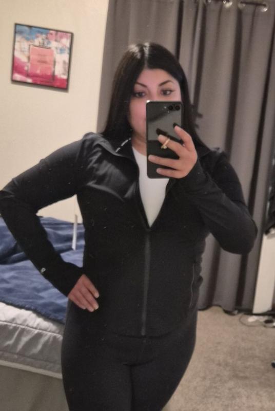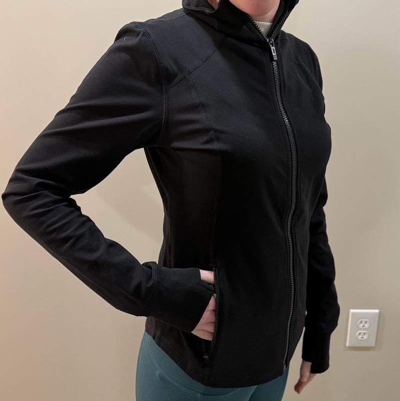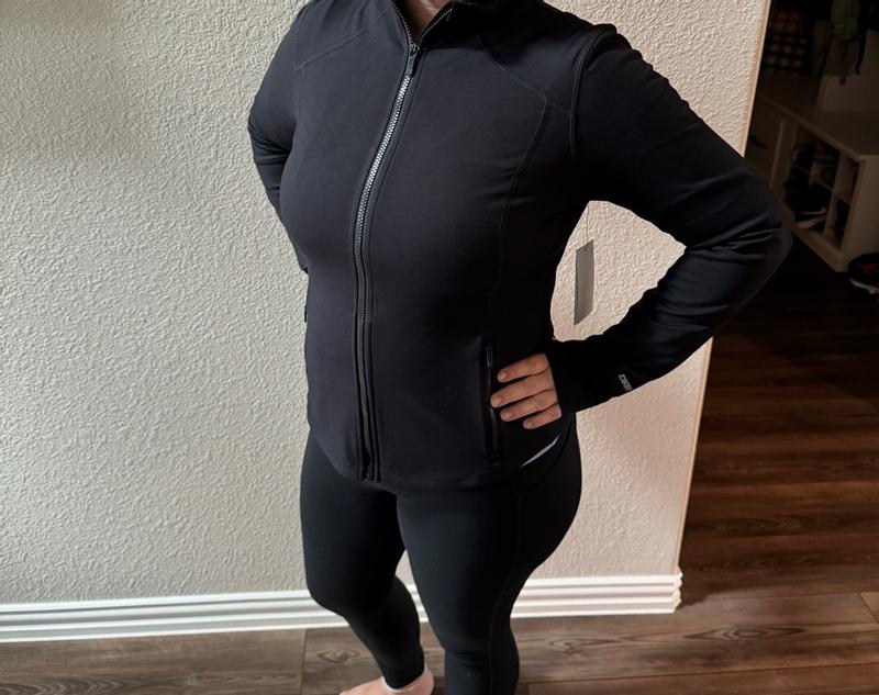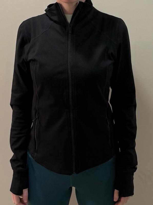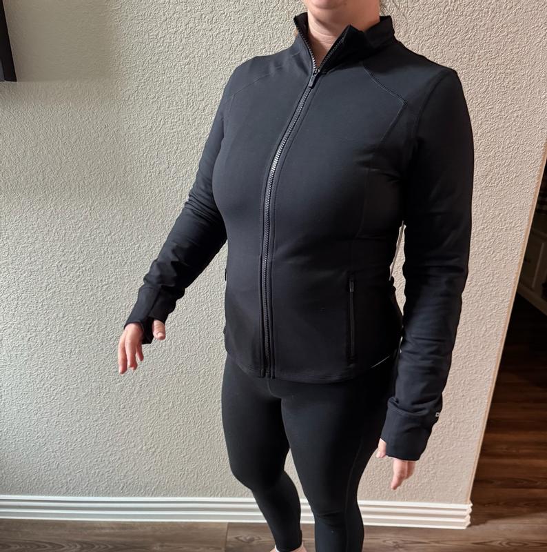 This is a really well designed fitness jacket. The fit is flattering and streamlined without feeling too tight or restrictive. I have long arms, which can make sleeves tricky, but the length on this one is perfect. The details are thoughtfully done. The zippered pockets are great for keeping items secure, and the interior pockets and thumb holes are nice added touch. The fabric is soft and stretchy with a comfortable medium weight, making it versatile for a range of temperatures…from cool mornings to layering during workouts. Overall, it feels high-quality and functional, and it’s a jacket I’d definitely recommend.