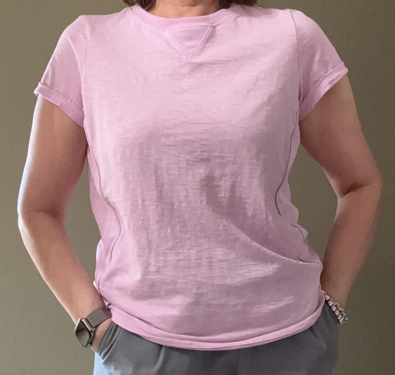 I really like this top. The fabric is cool, comfortable and 100 percent cotton. I also like the styling with the rolled sleeves and the vertical front seams. The front seams seem to be slimming, which I appreciate. However, those seams puckered up after washing and drying the shirt for 15 minutes on low. I pulled the seams to make them smooth and hung the shirt to finish drying. This isn’t a huge deal for me, because I hang dry a lot of my clothing. I also want to note that this shirt seems to run just a little bit smaller than I expected. Usually, my size large T-shirts give me plenty of extra room but this one does not. I do think the length is nice, as a 5 foot eight person. It seems long enough. All in all this is a nice shirt and I like it a lot!