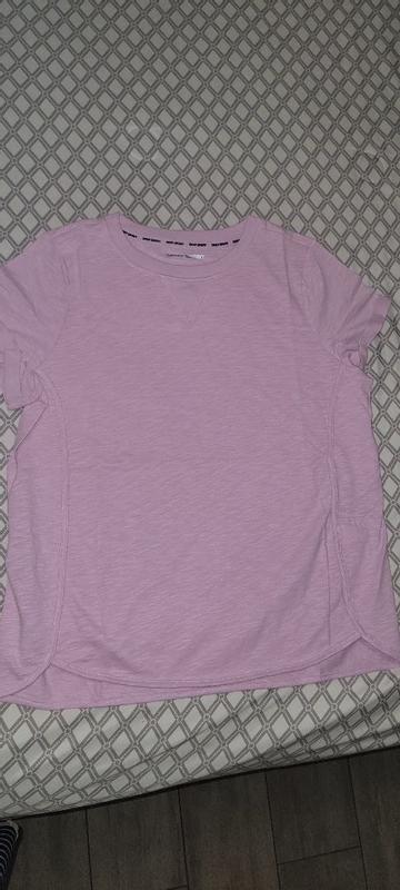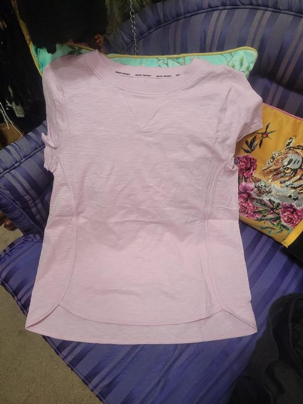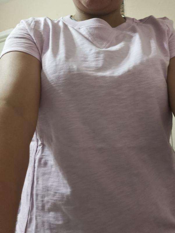 I got this DKNY pink lavender cotton tee and is really comfortable. I am a size medium got an Small but fit well. I really liked it is really well made the stitching look fine. Perfect for an everyday use.