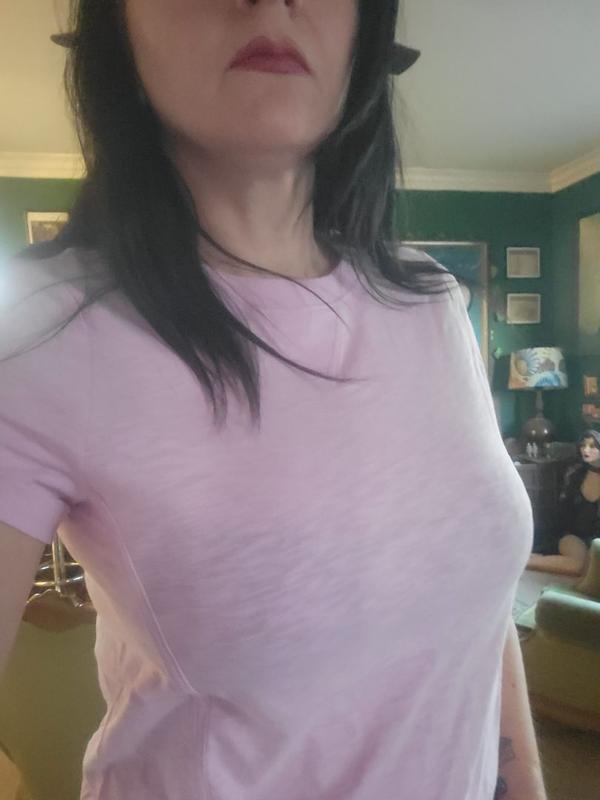 Sadly, I didi not like anything about this shirt. I didn't like the color, the boxy fit, the additional side stiching. It is a little too see-through and slightly tight around the arms. I would try another style and color but this was a straight no for me.