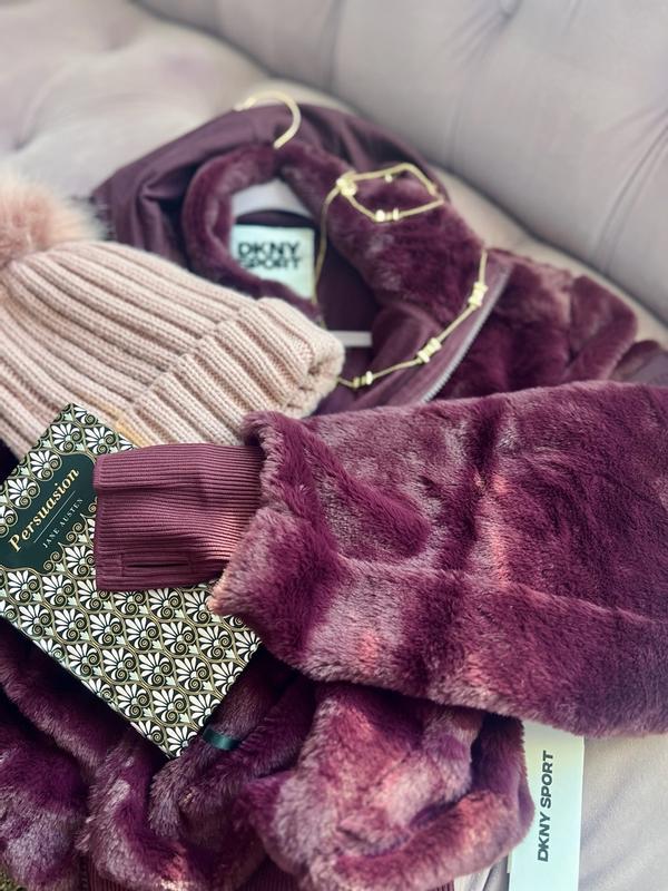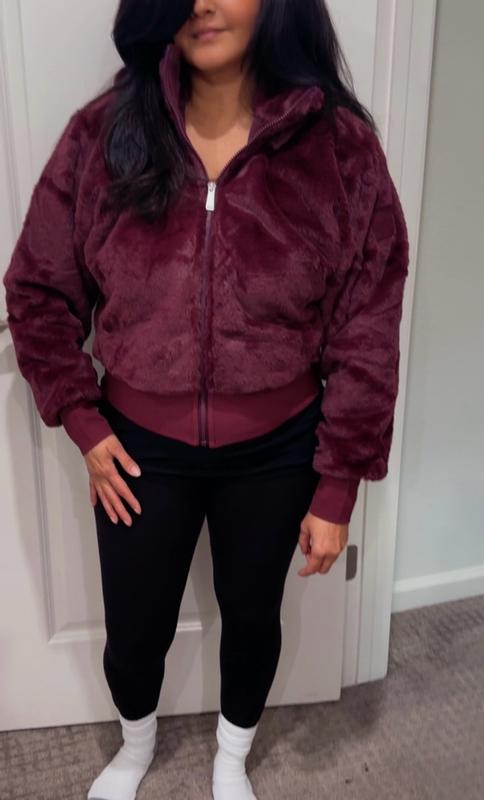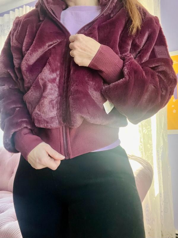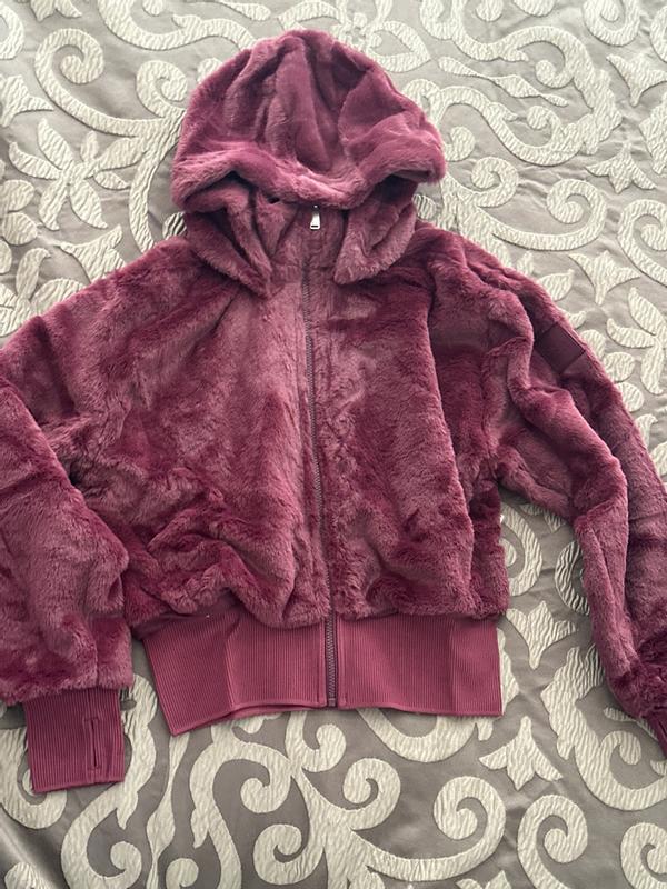 So, this jacket feels SUPER SOFT! It’s a cropped fit and I love the little thumb holes in the sleeve cuffs, makes for a sporty look. It’s loose and comfy and has a detachable hood, which is a nice touch. The color is really pretty and I appreciate that it’s faux fur, but with no weird chemically smells. Care seems pretty simple too - machine wash cold! So I can throw this in with my world sweaters and voila!