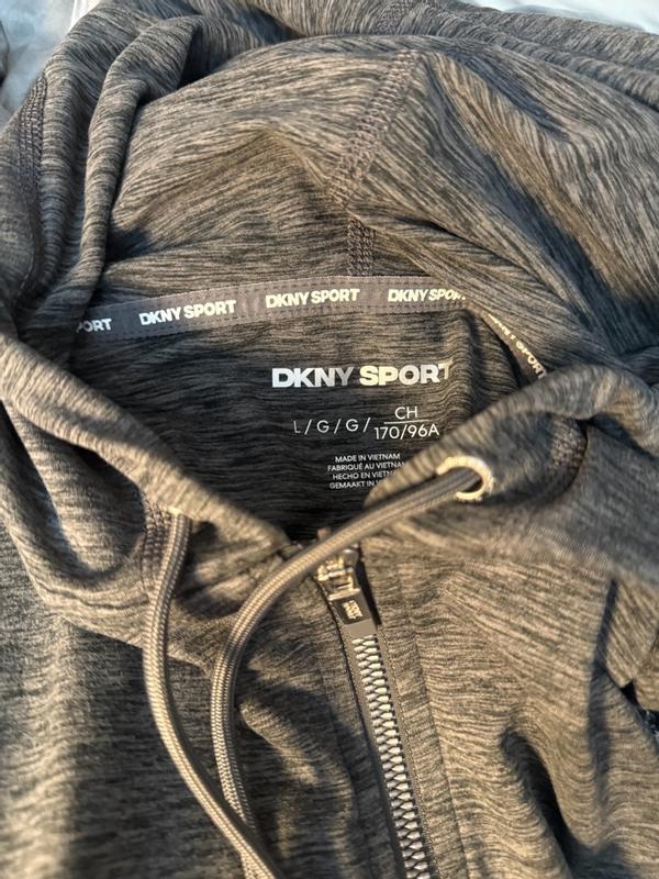 The space dye DKNY line is so soft and comfy. I wish they would make more colors because I love that you can wear it open or closed, has a hood and the logo is small. 5’2 120 M hood and bottoms fit but also I’ve lost some weight and I prefer both not super fitted.