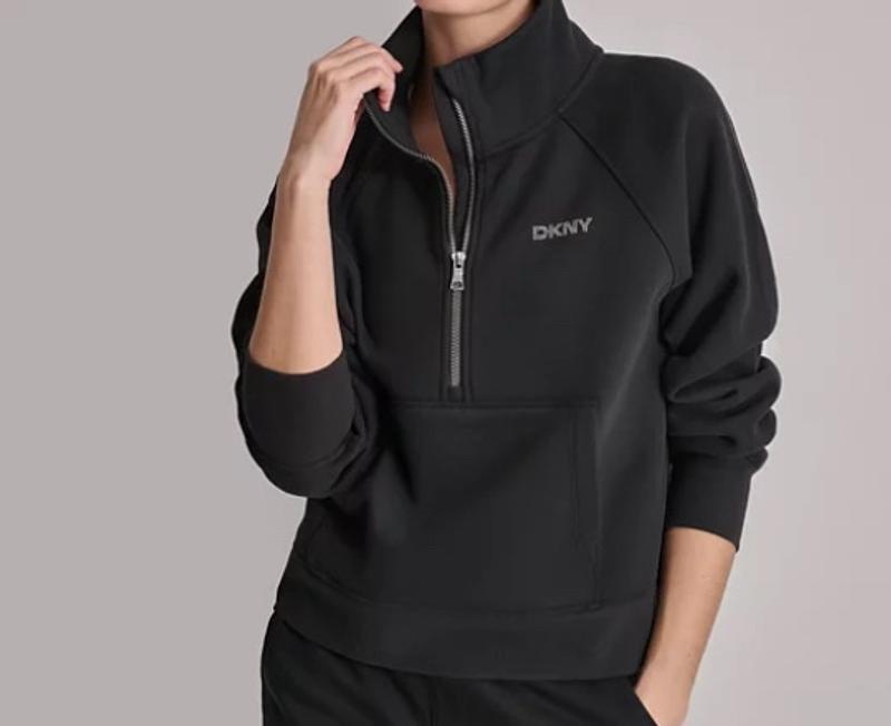 This DKNY sweatshirt exceeded my expectations in terms of quality. The fabric feels soft yet durable, not thin, and it keeps its shape after wearing. The half-zip works smoothly, and the collar looks great both zipped up or worn open. The studded logo adds a modern, stylish touch without being overdone. Stitching is well made, and the fit is true to size, making it very comfortable for everyday wear or elevated casual looks. Easy to style and very versatile.