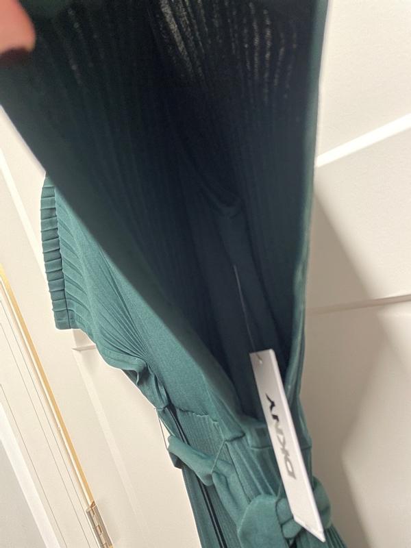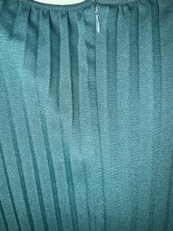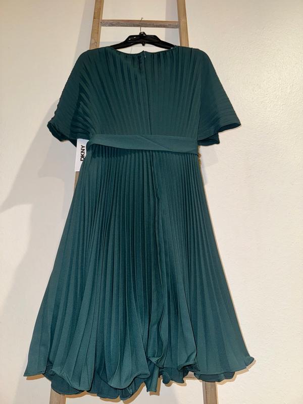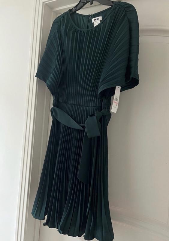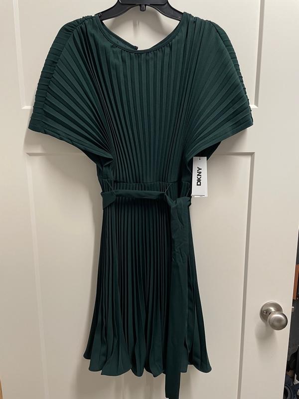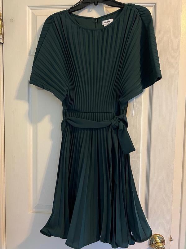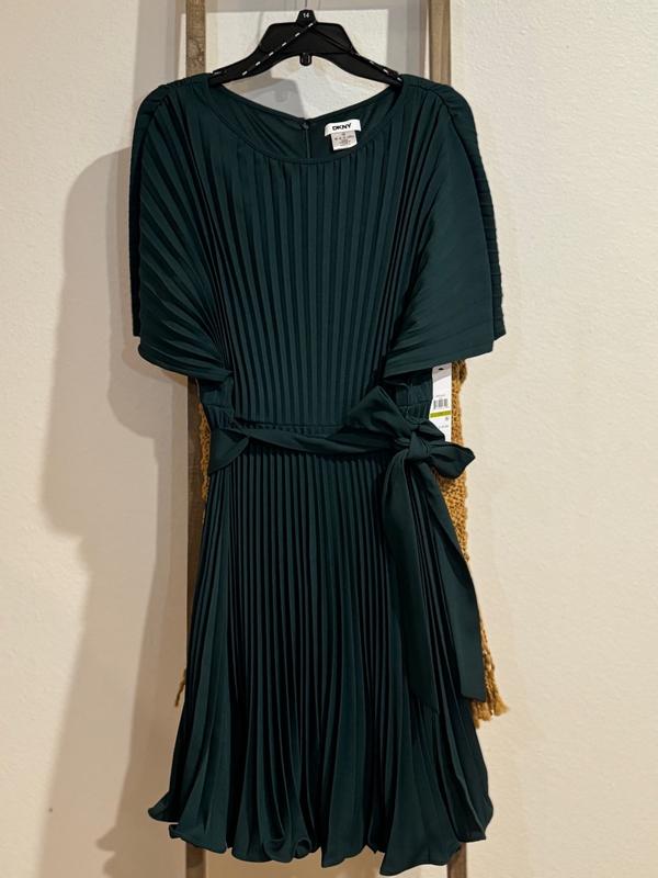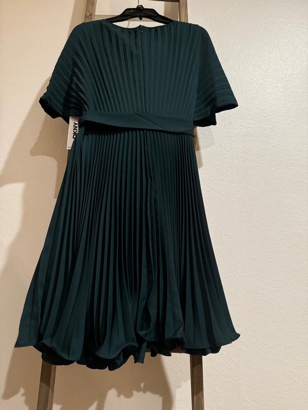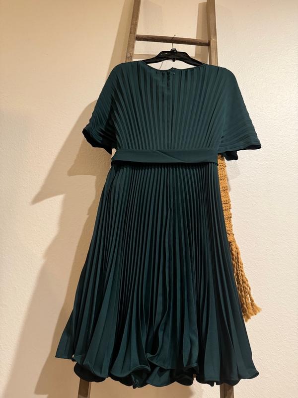 This dress is going to be great for work parties! The deep jewel tone green/spruce color is going to be great for the holidays. The fabric feels thick and substantial and the pleats are more forgiving with the body shape. The belt/bow at the waist helps to give it shape; without it, I may have felt like a box of pleats.