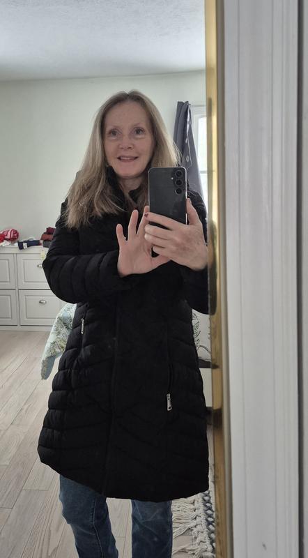 This coat keeps me warm in extreme cold weather, even in very windy conditions. I love the double collar and the fabric-feel finish on the outside of the coat.