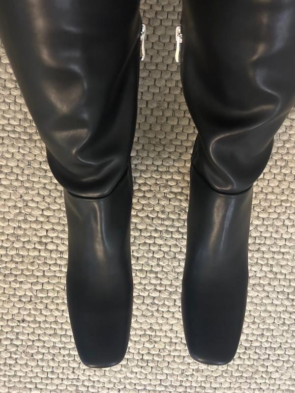 These boots are gorgeous! I love the "snake" look design and there is a stylish silver design at the top of the block heel. The square toe make a great true to size fit.